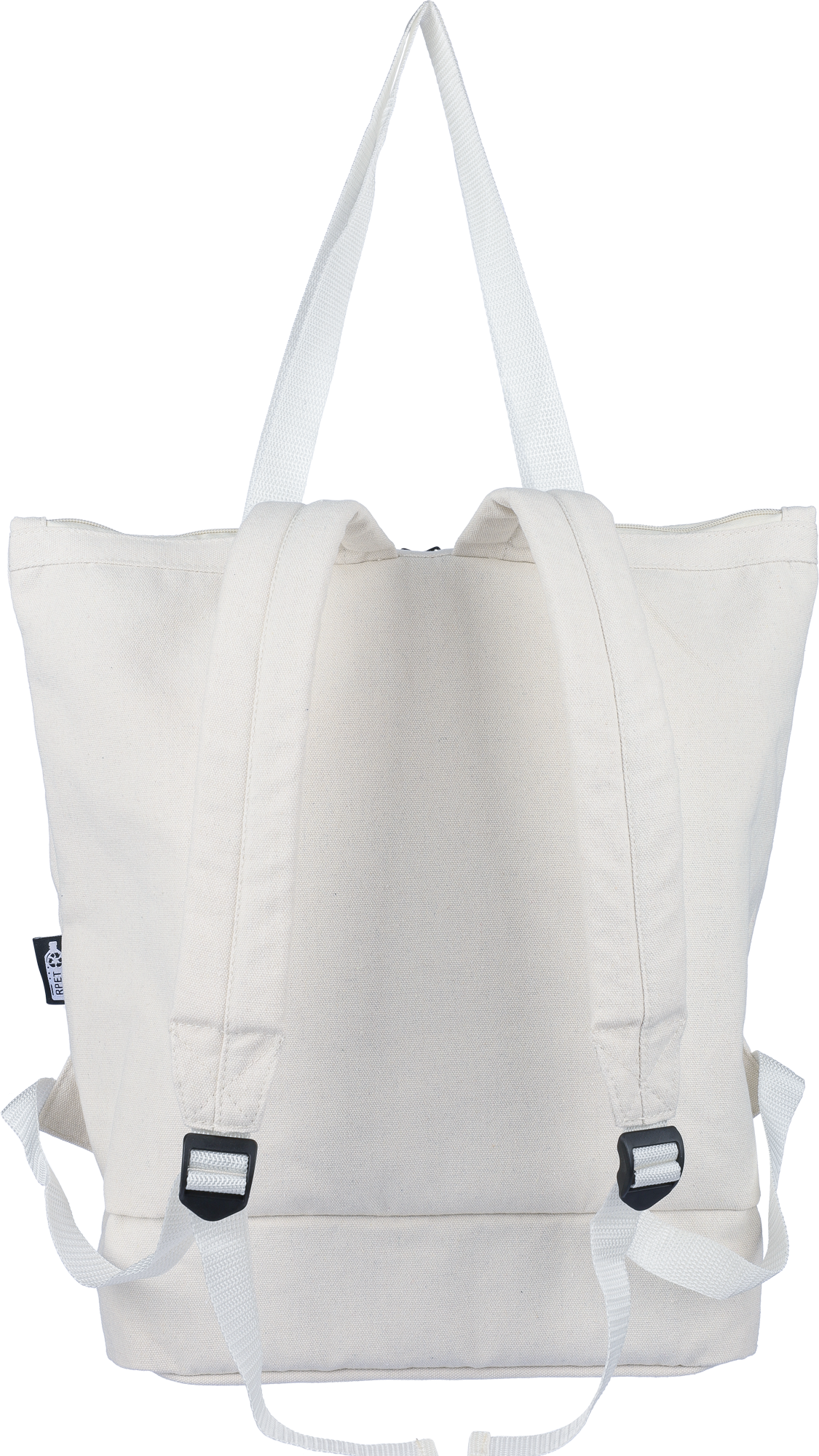Recycled polycotton tote backpack with a 210D polyester lining. Features a large zipped compartment at the top, and a zipped compartment at the bottom, a laptop compartment for 15-inch laptop and various other pockets. Includes long carrying handles and padded adjustable shoulder straps. Capacity: 30L. Carrying capacity: 15 kg.