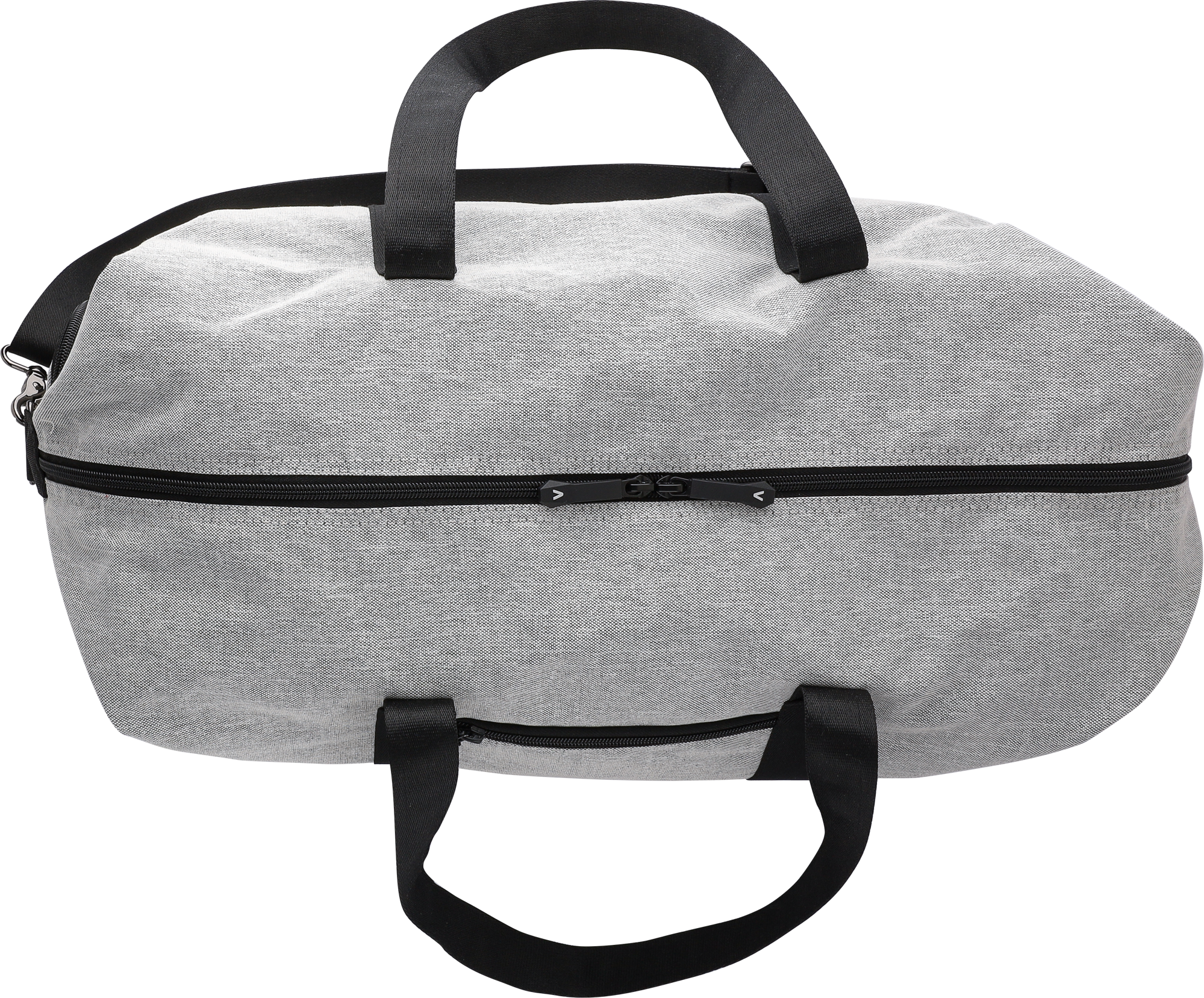 Polyester recycled travel bag with PU leather details. Includes a small zipped pocket on the front, a large zipped main compartment and a shoe pocket on the side. Supplied with adjustable shoulder strap and two carry handles.