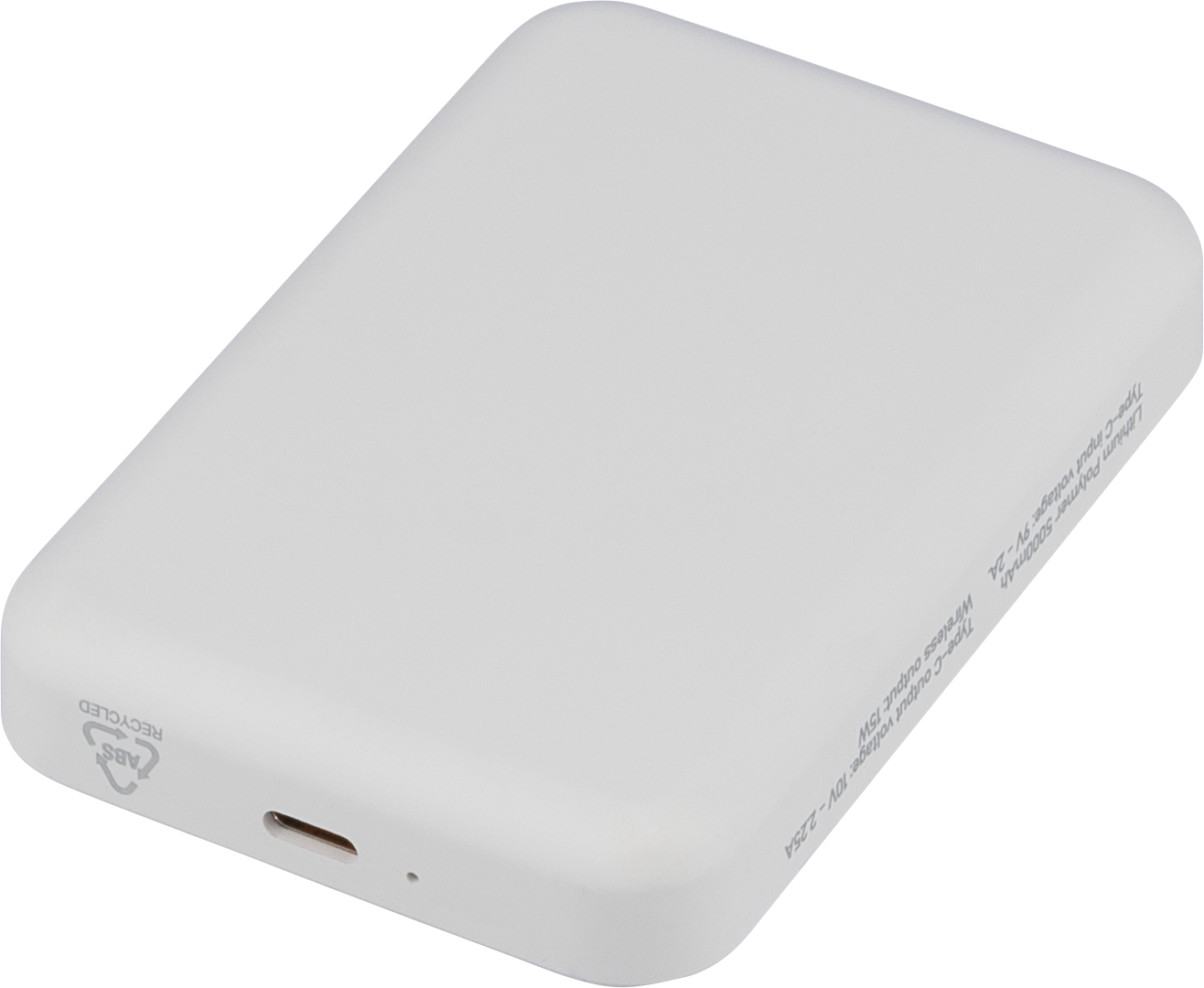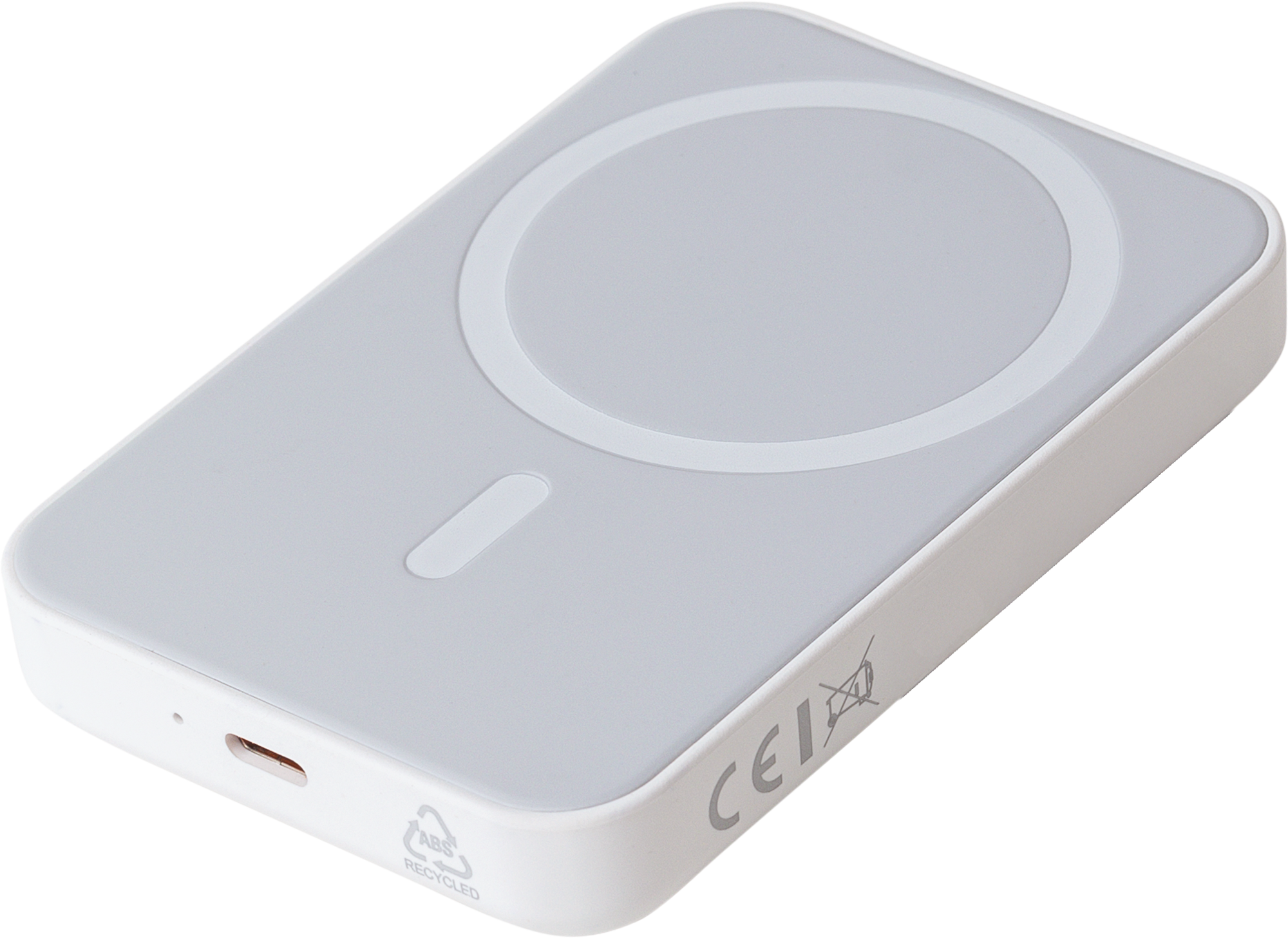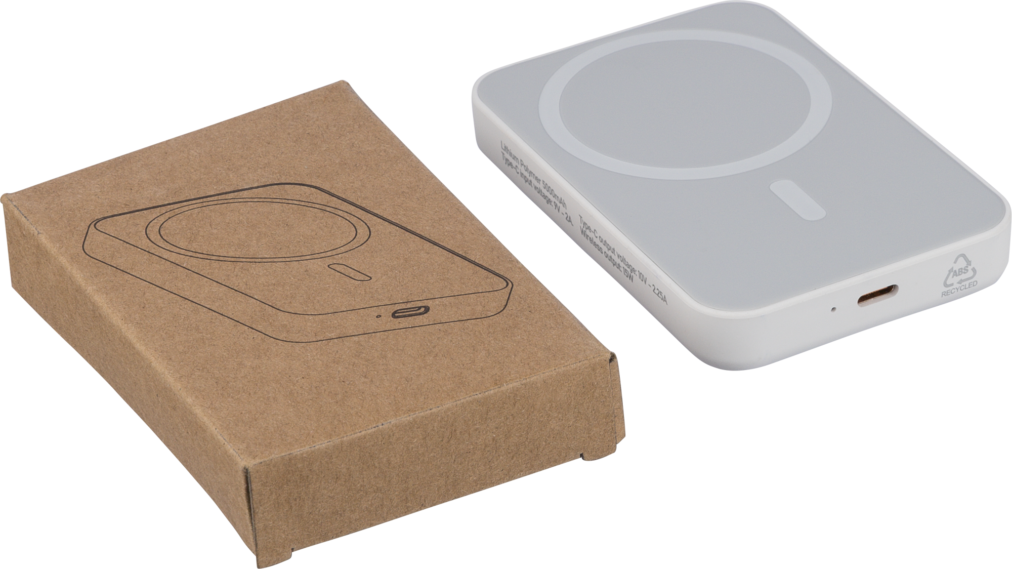 Recycled wireless charger powerbank with a 5,000 mAh capacity. 15W MagSafe-compatible wireless charging. Type-C in/out, safety protections, auto shut-off. Includes metal ring for non-MagSafe. Recycled logo on side. Packed in brown box