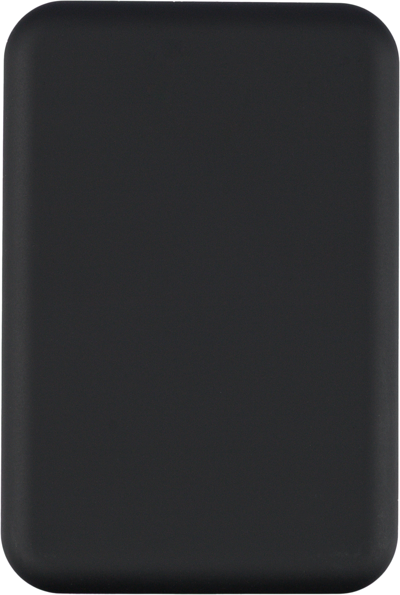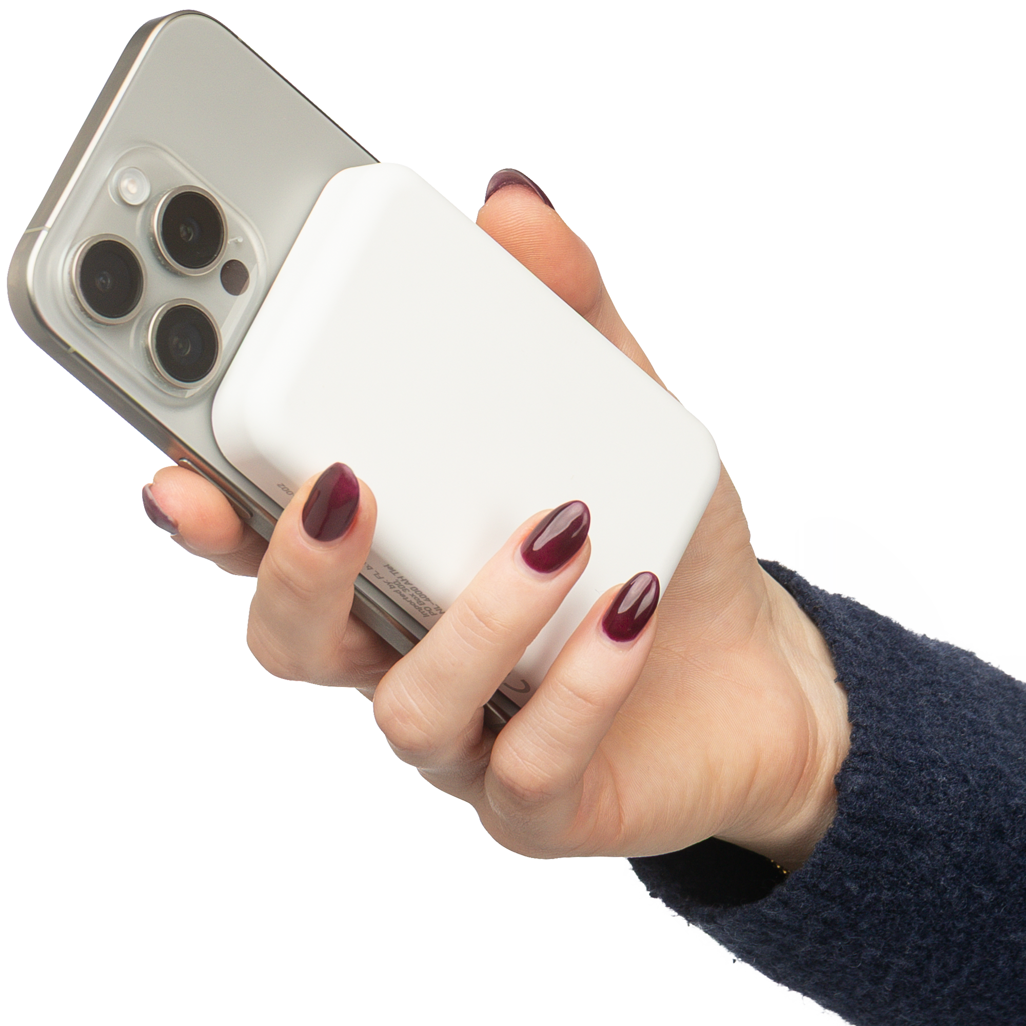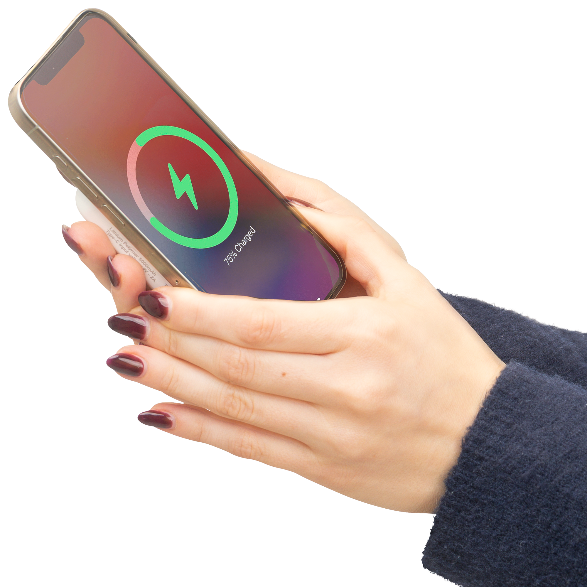 Recycled wireless charger powerbank with a 5,000 mAh capacity. 15W MagSafe-compatible wireless charging. Type-C in/out, safety protections, auto shut-off. Includes metal ring for non-MagSafe. Recycled logo on side. Packed in brown box