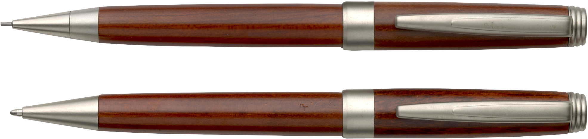 Rosewood ballpen with blue ink and pencil in a rosewood presentation box.