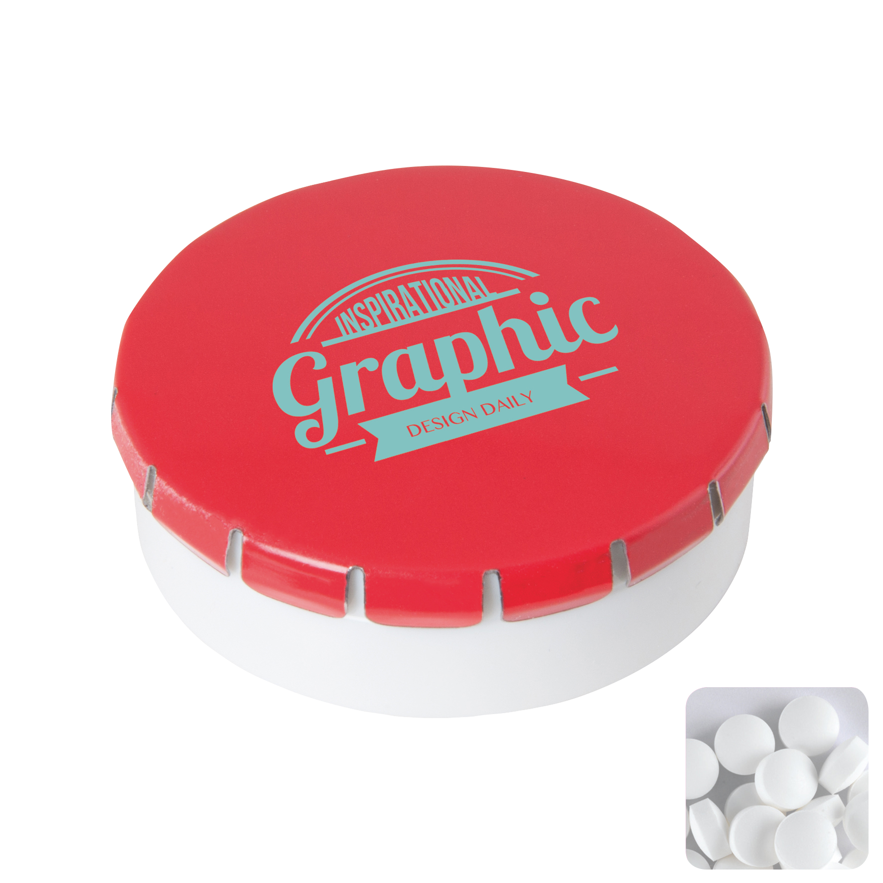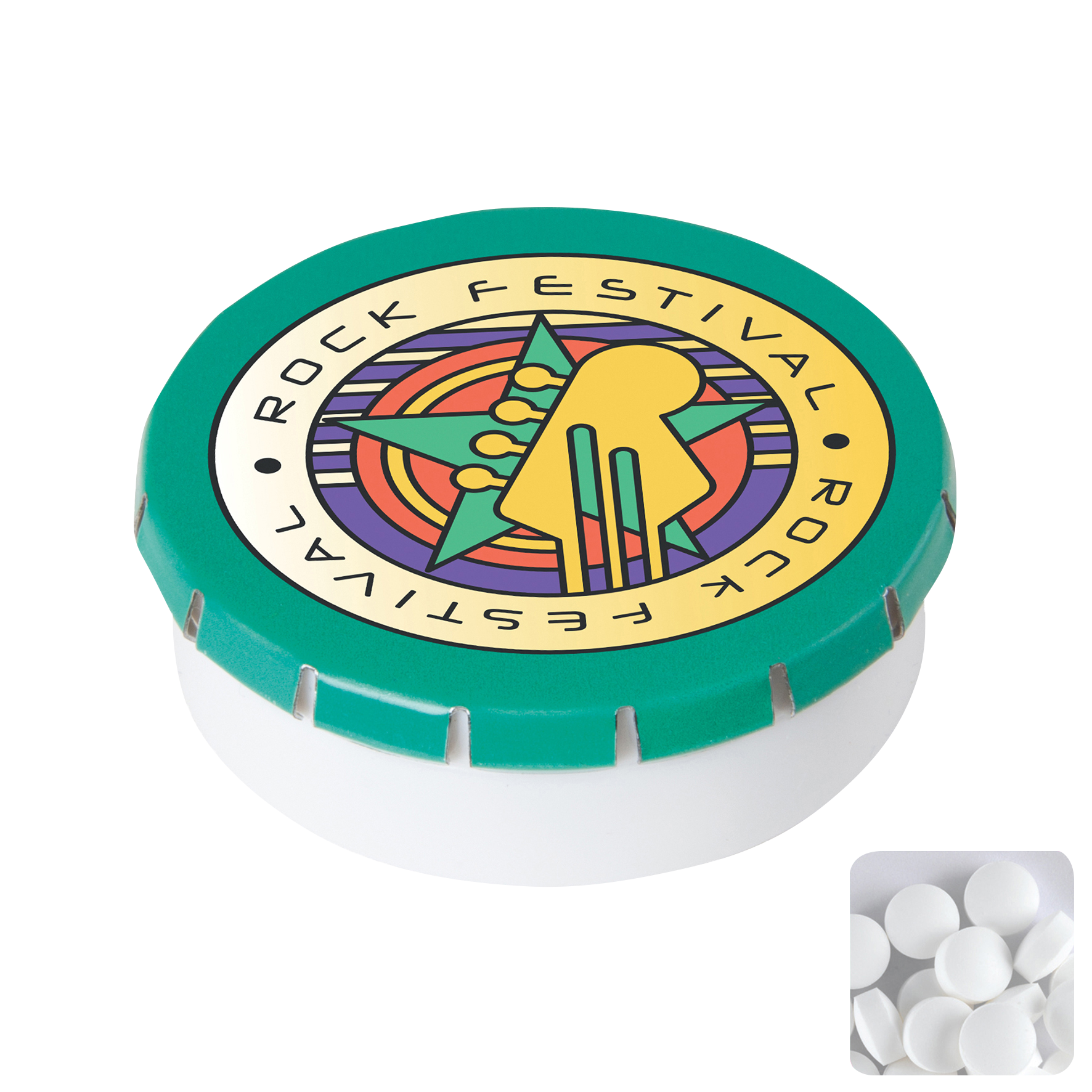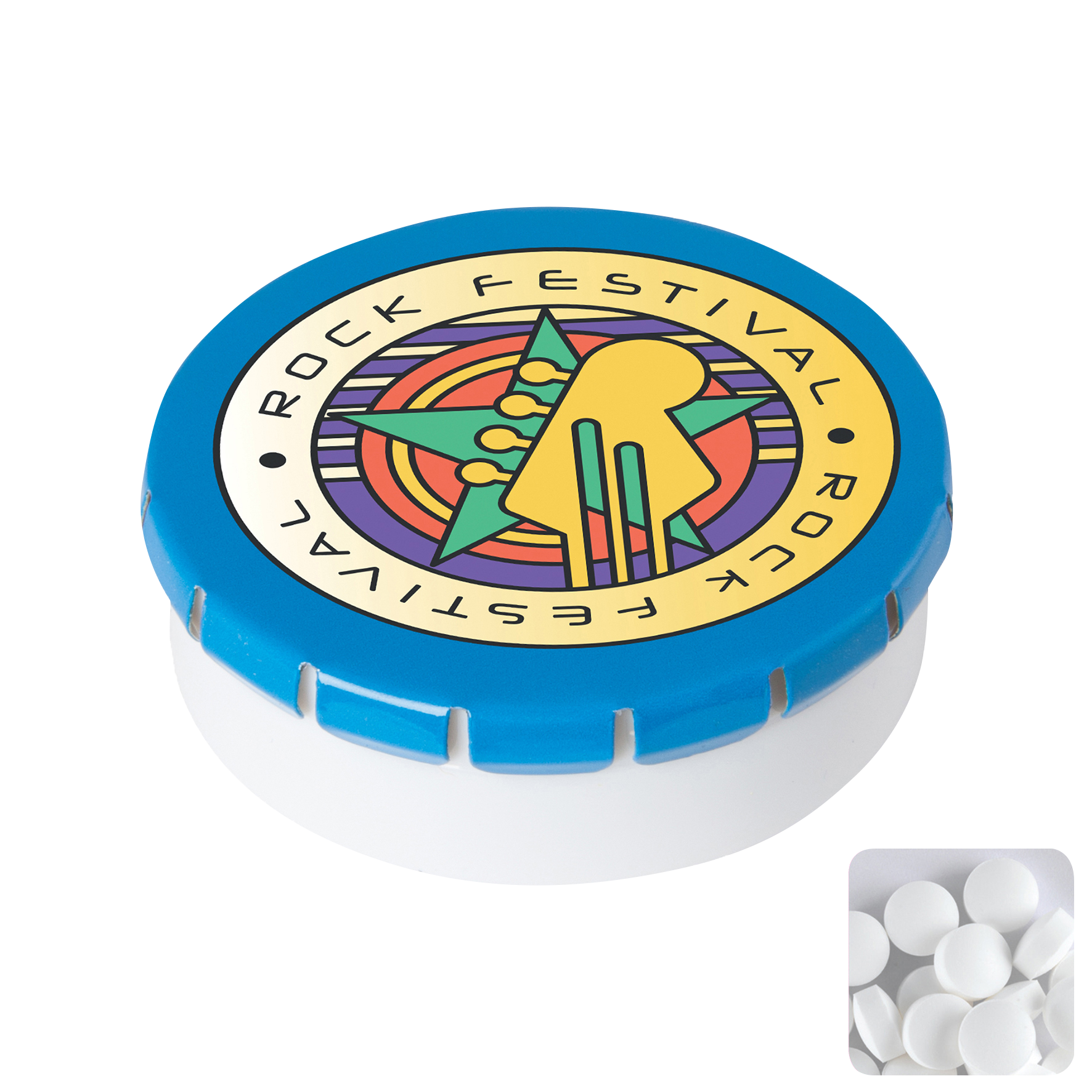 Round click plastic pot with sugar free extra strong mints with coloured click type lid made of tin and filled with approx. 12g of sugar free mints