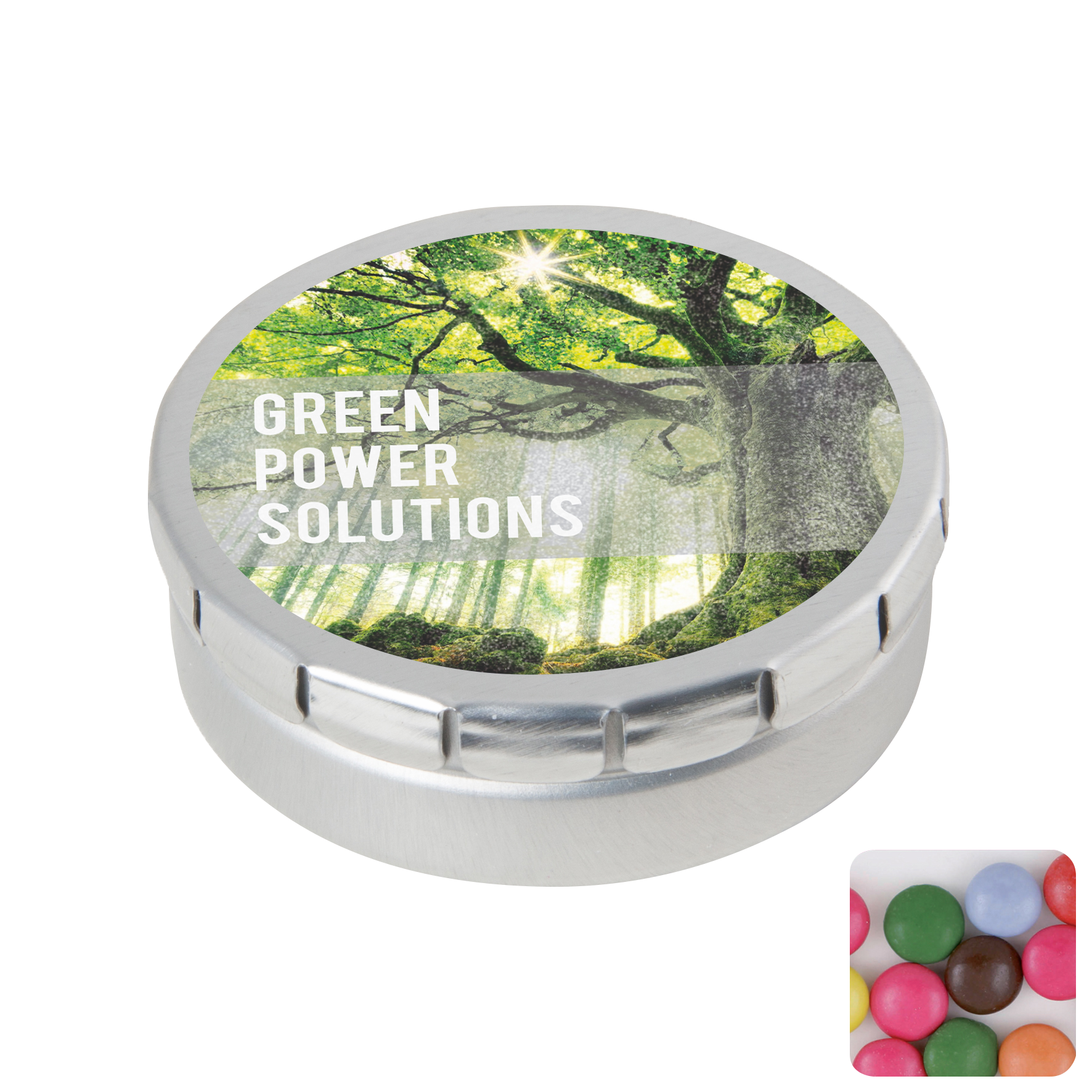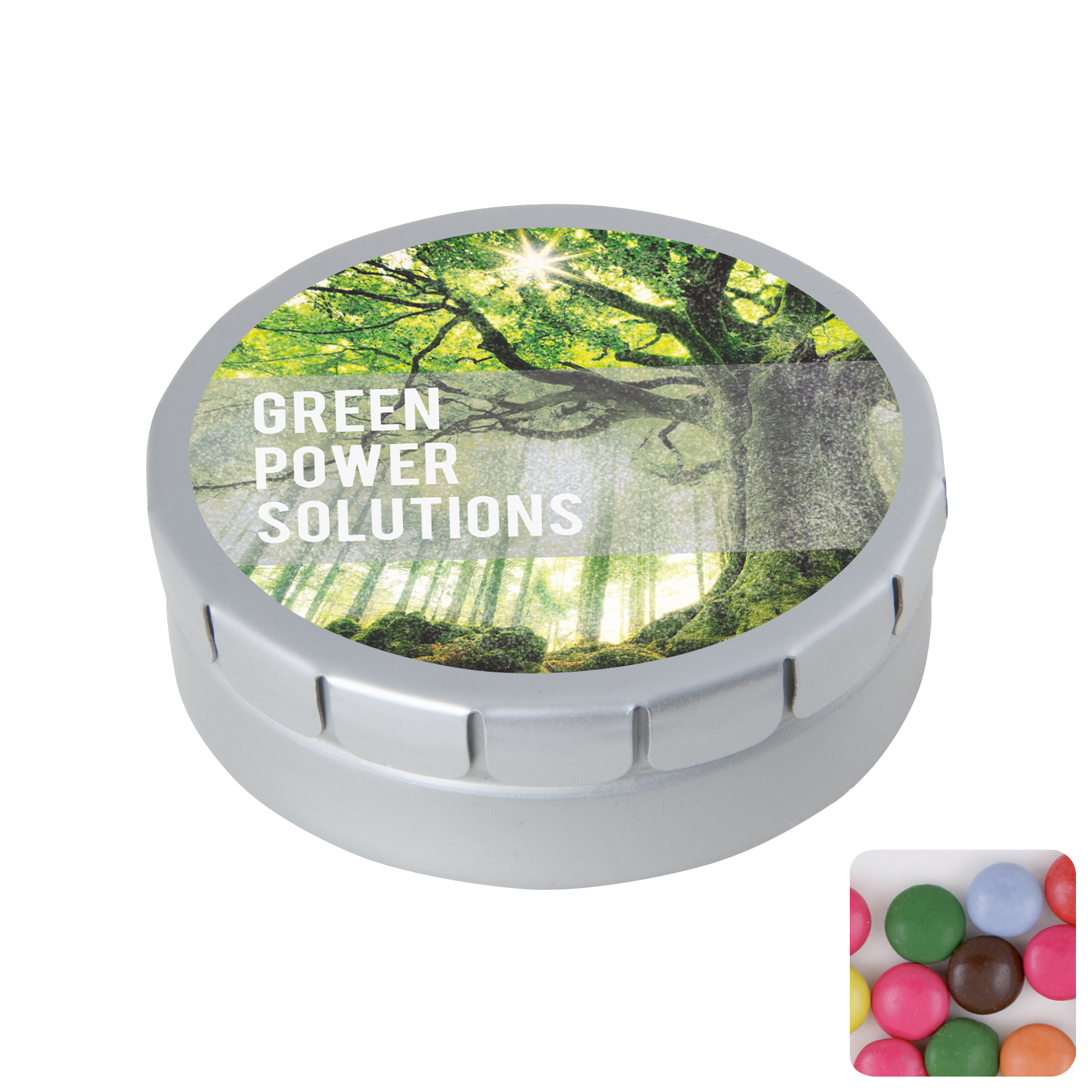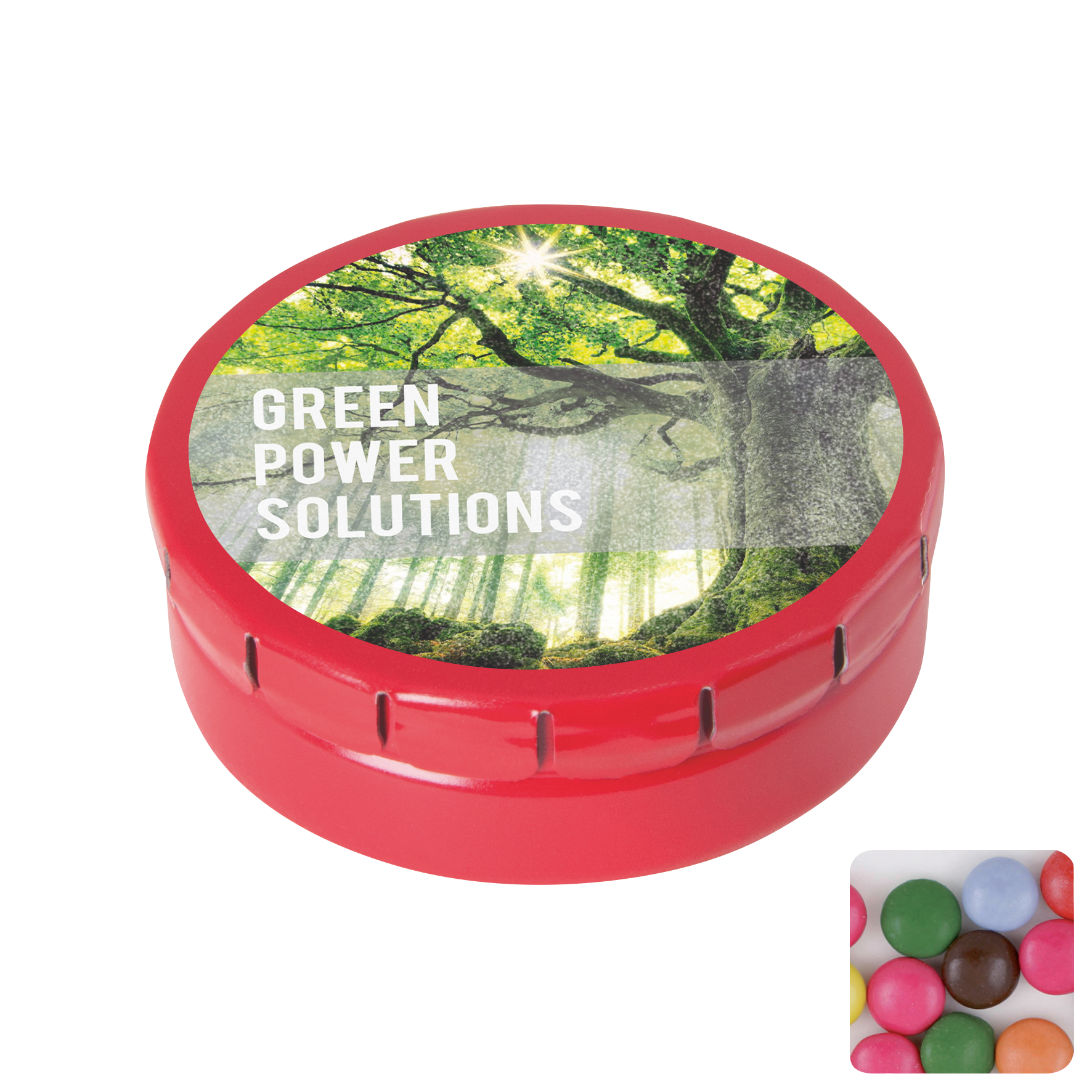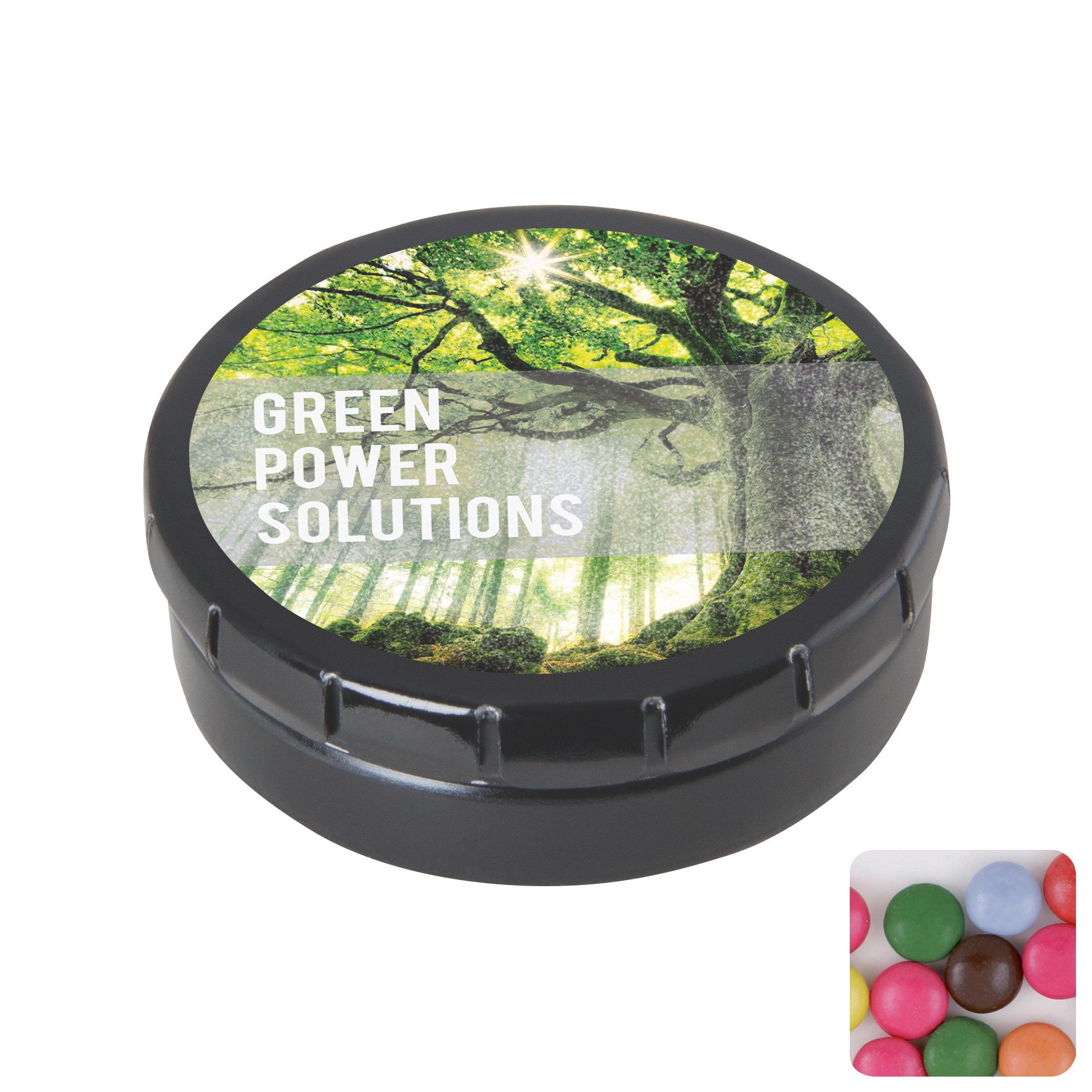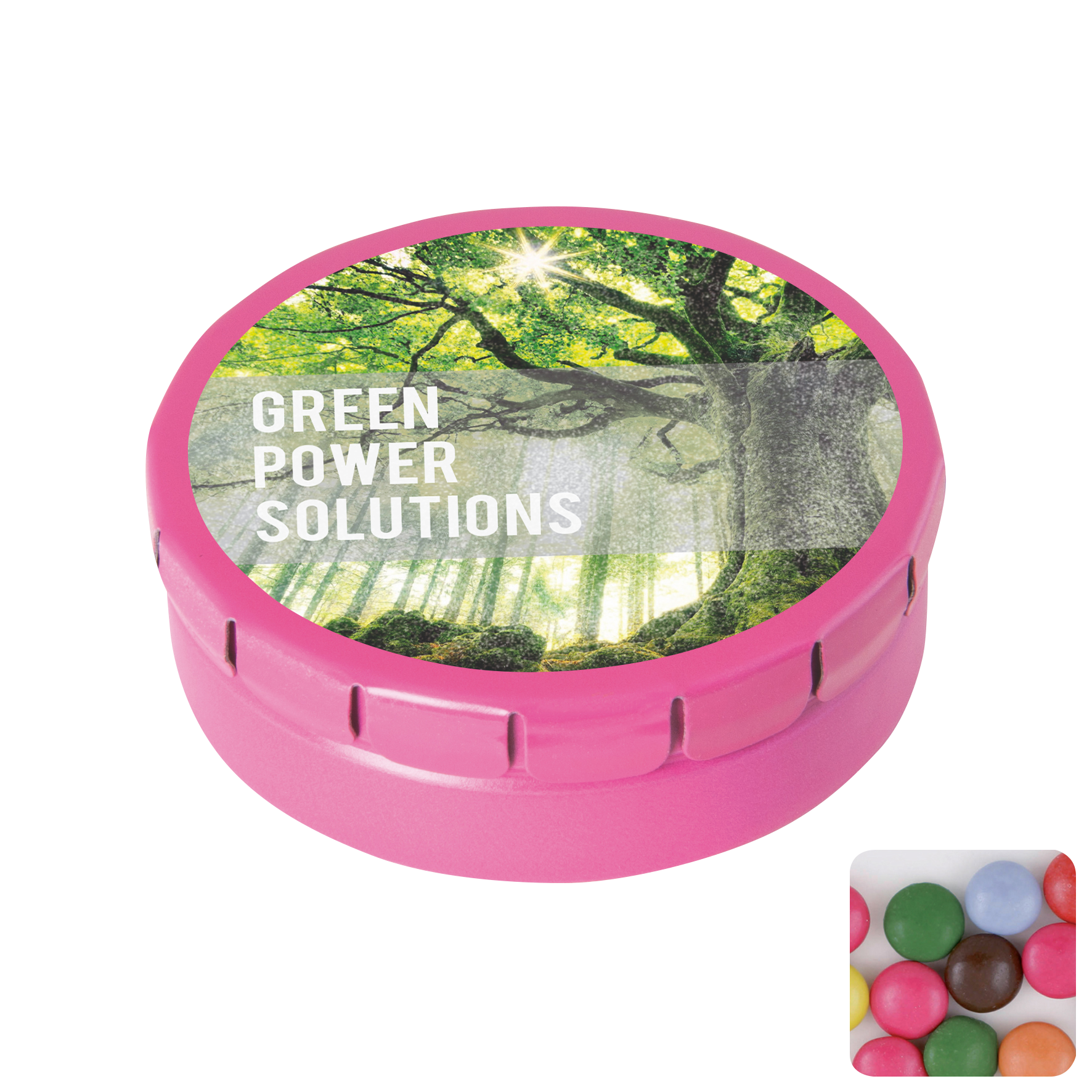 Click tin with milk choco's. Supplied with a mix of chocolate colours.
