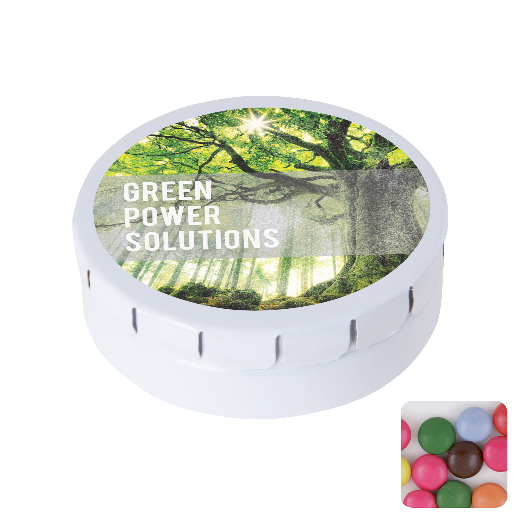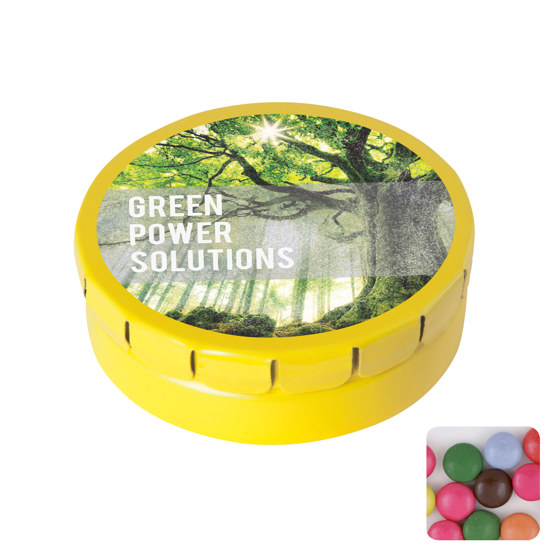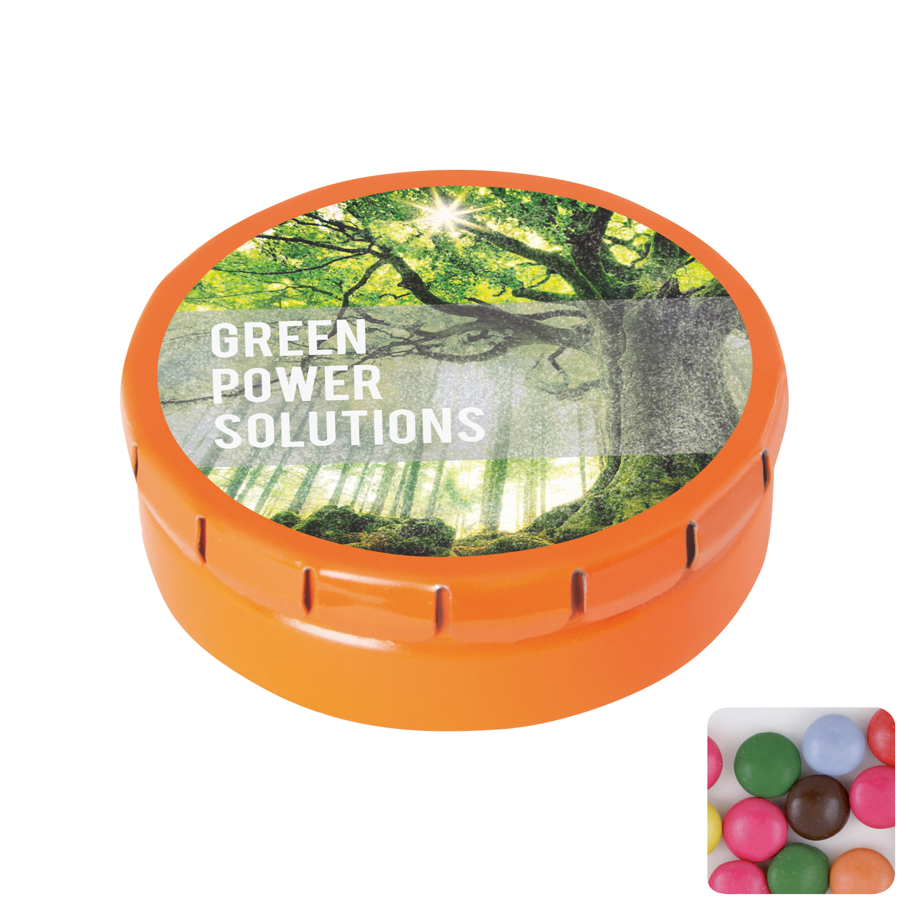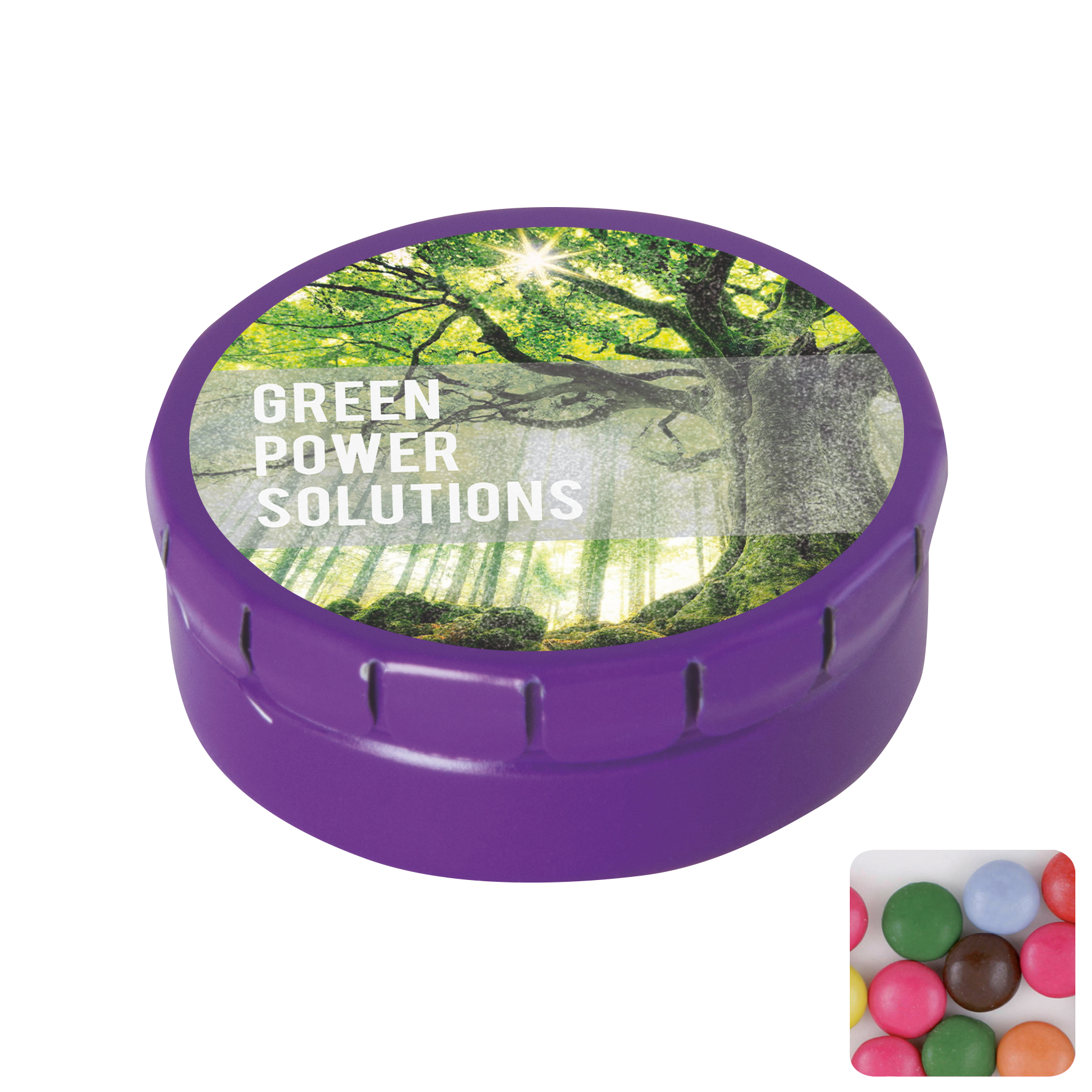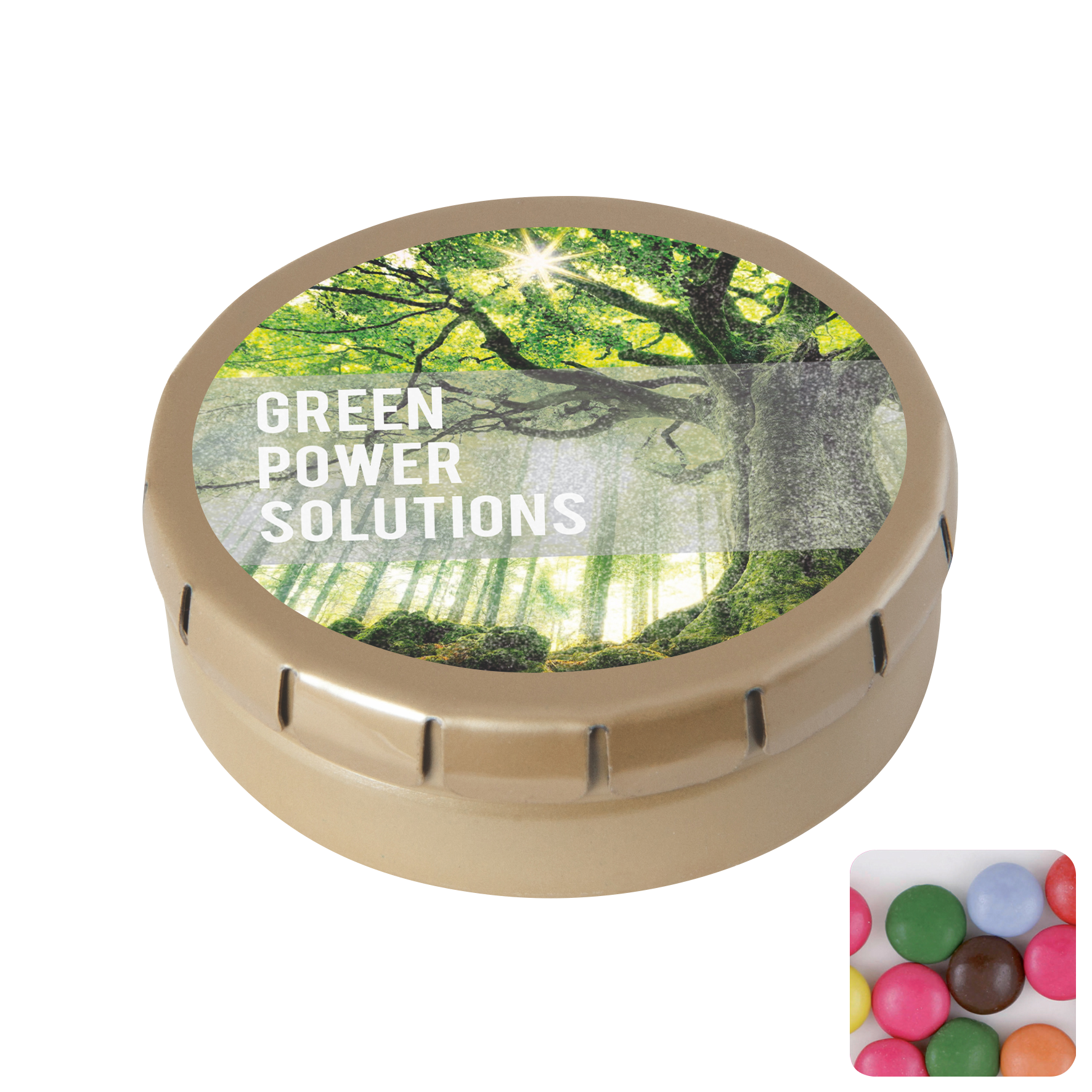 Click tin with milk choco's. Supplied with a mix of chocolate colours.