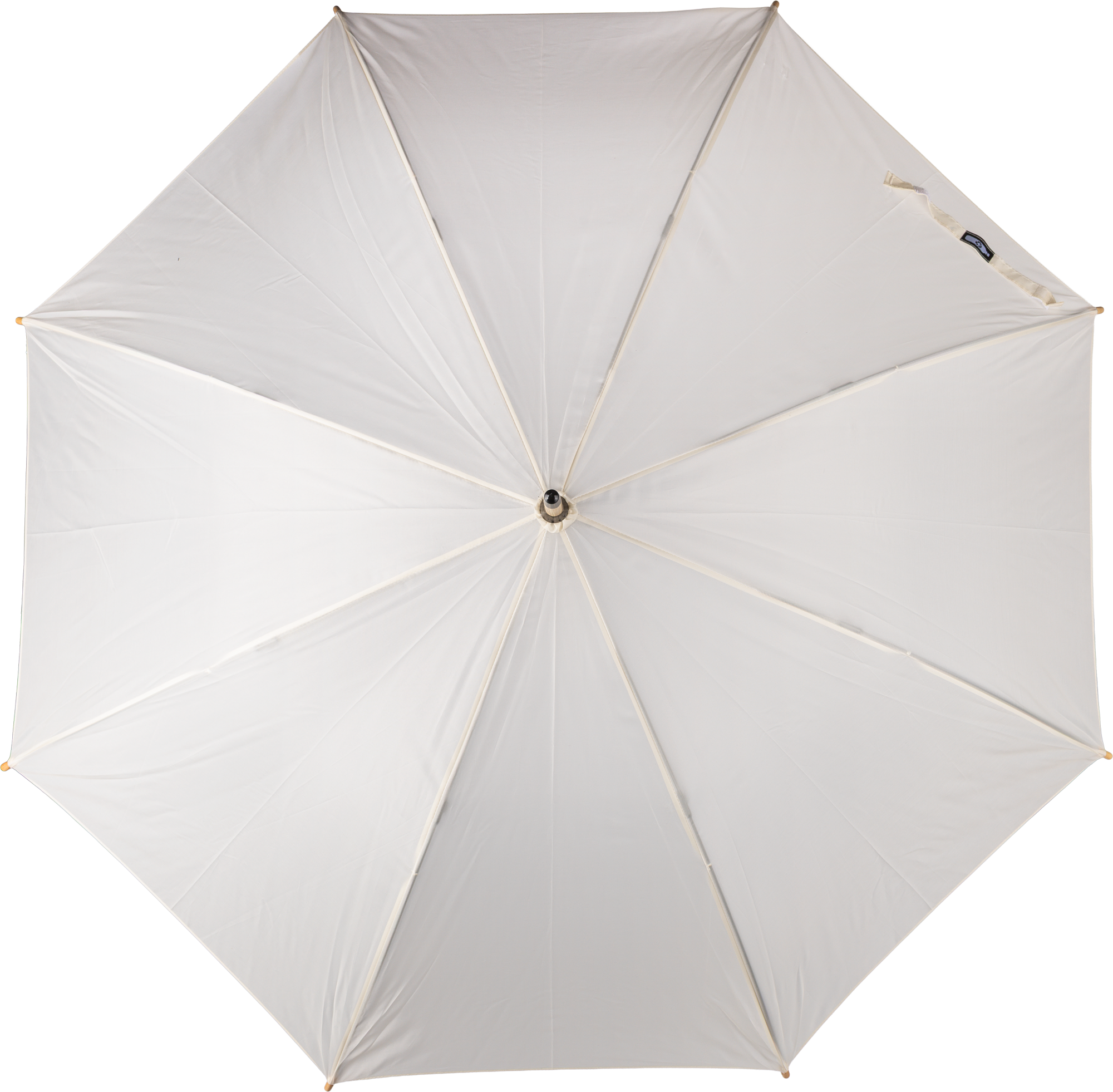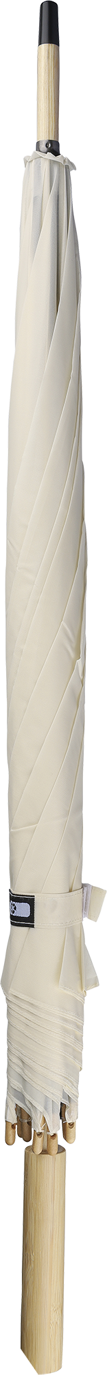 RPET automatic golf umbrella with eight panels with a bamboo handle and bamboo and steel shaft with metal frame. Includes velcro closing strap and rPET label.