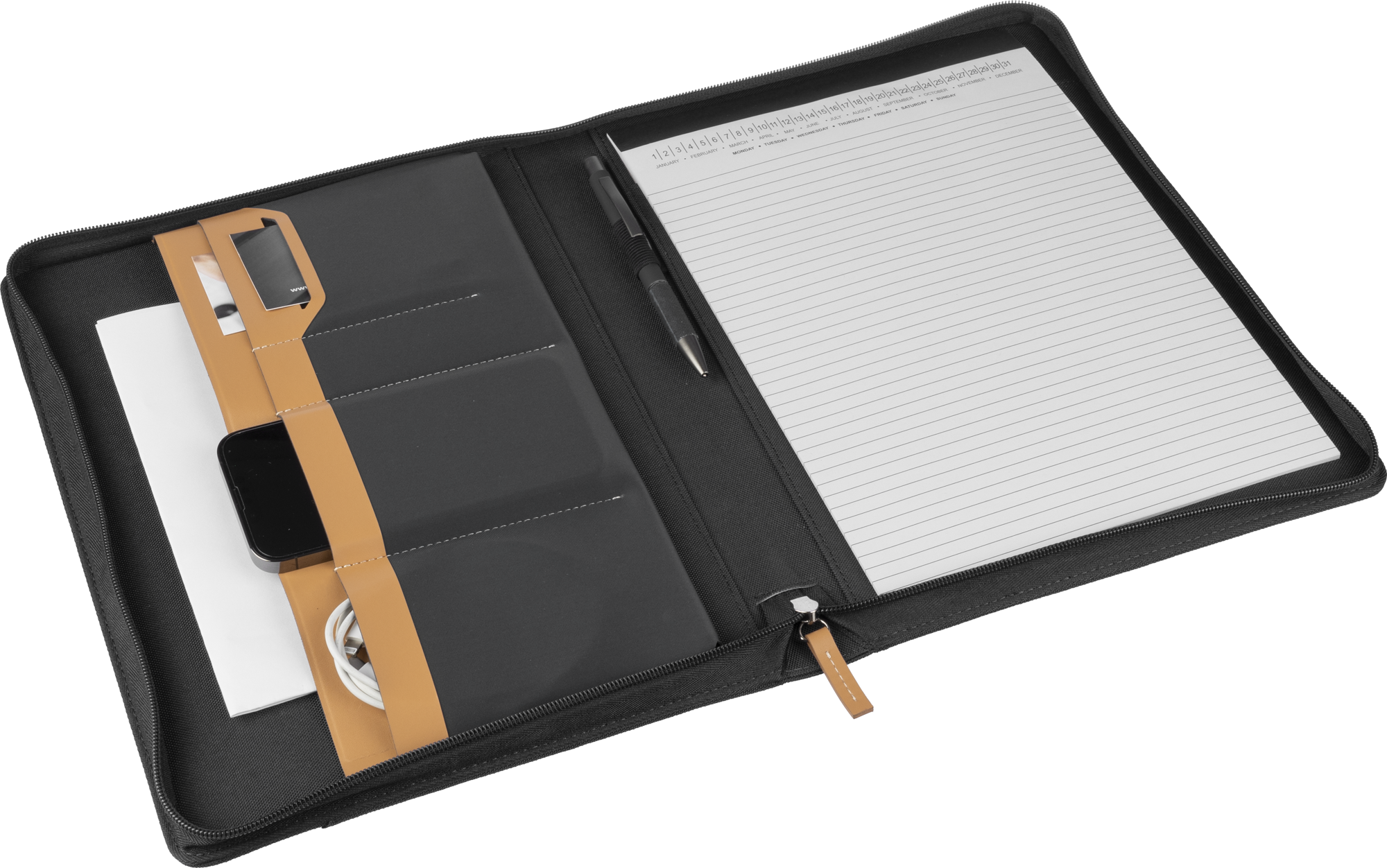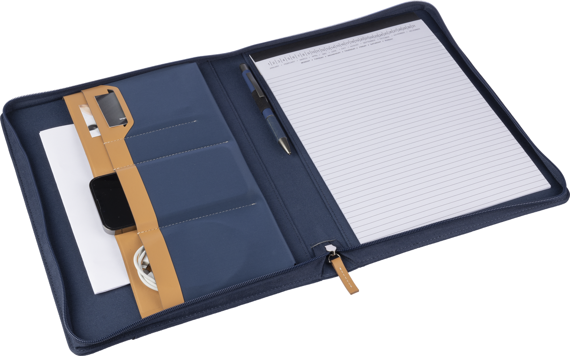 RPET portfolio (approx. A4) with PU detail and zip. Includes a notebook with 20 lined pages, multiple compartments, pen loop and small pocket on the front. Individually packaged in a brown kraft box.