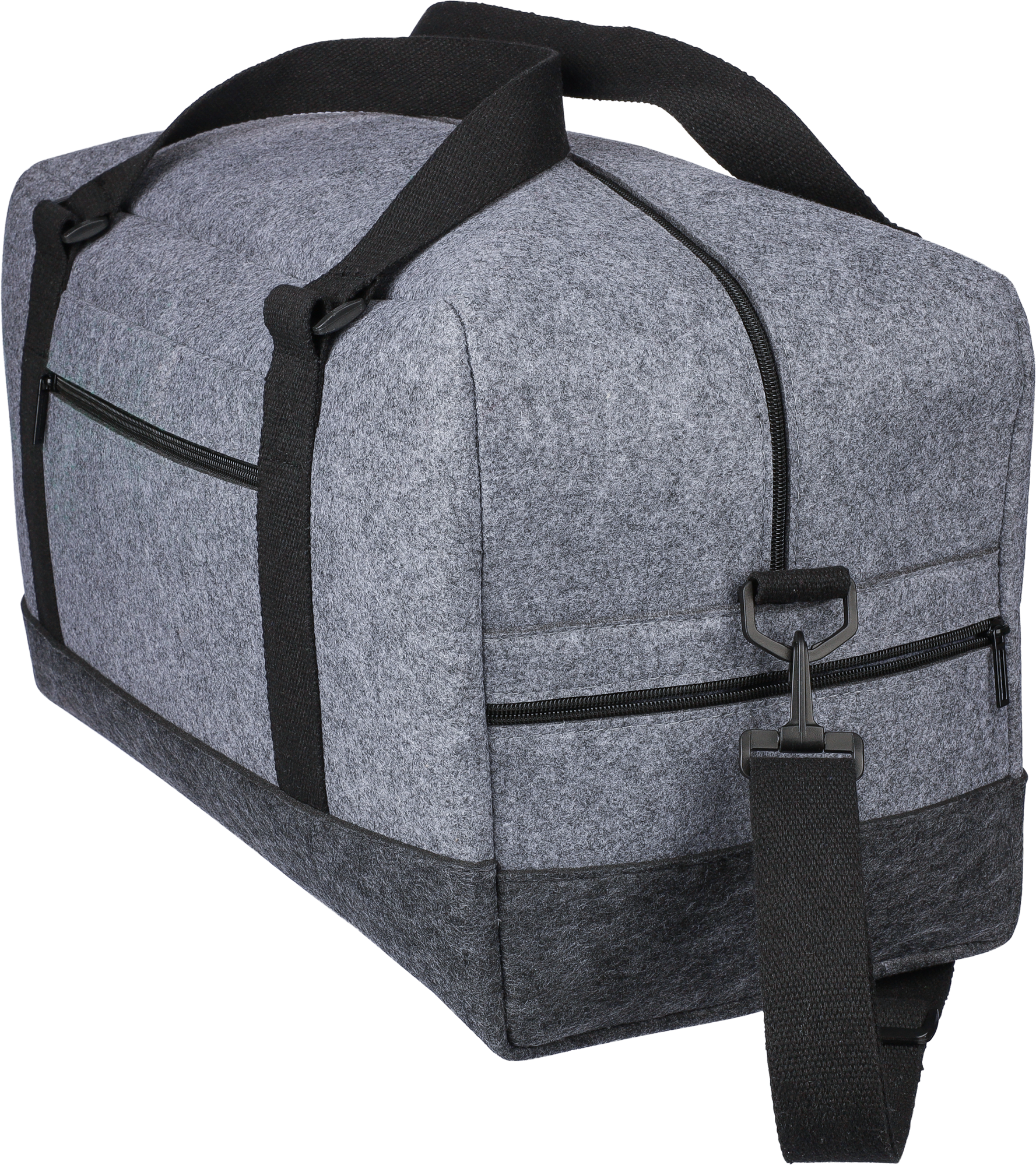 Sports bag made of RPET felt with canvas carrying handles, and an adjustable shoulder strap. Features a large zipped compartment and a small zipped pocket. Capacity: 30L. Carrying capacity: 10 kg.