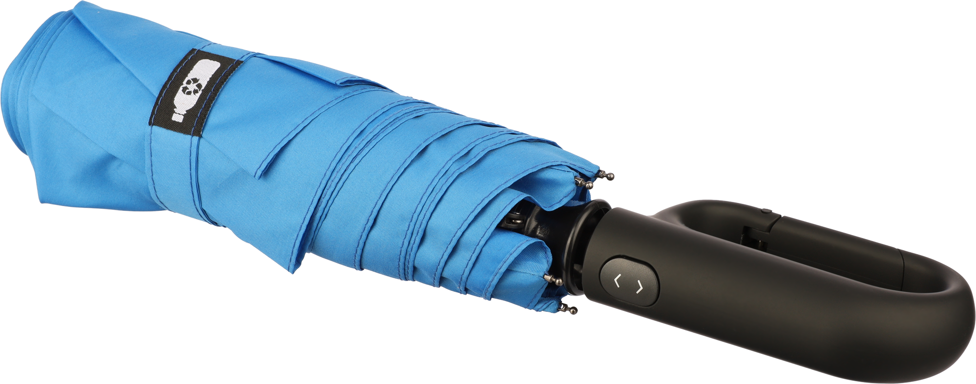 RPET 190T telescopic automatic umbrella with six panels and a fiberglass frame.