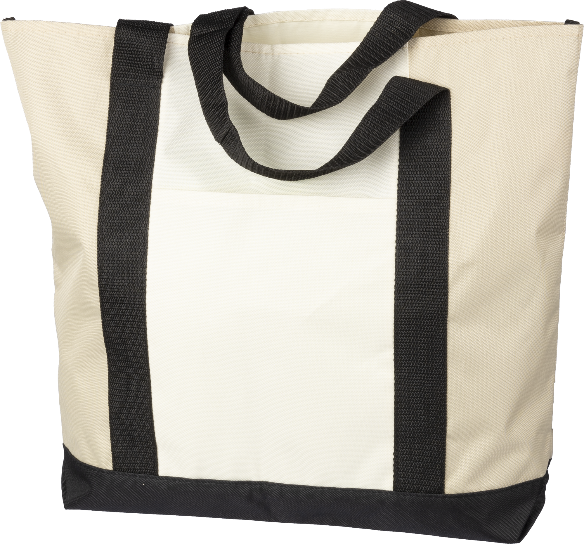 Tote bag in a 600D RPET with long handles, a large compartment on the topside and an open pocket on the front side.