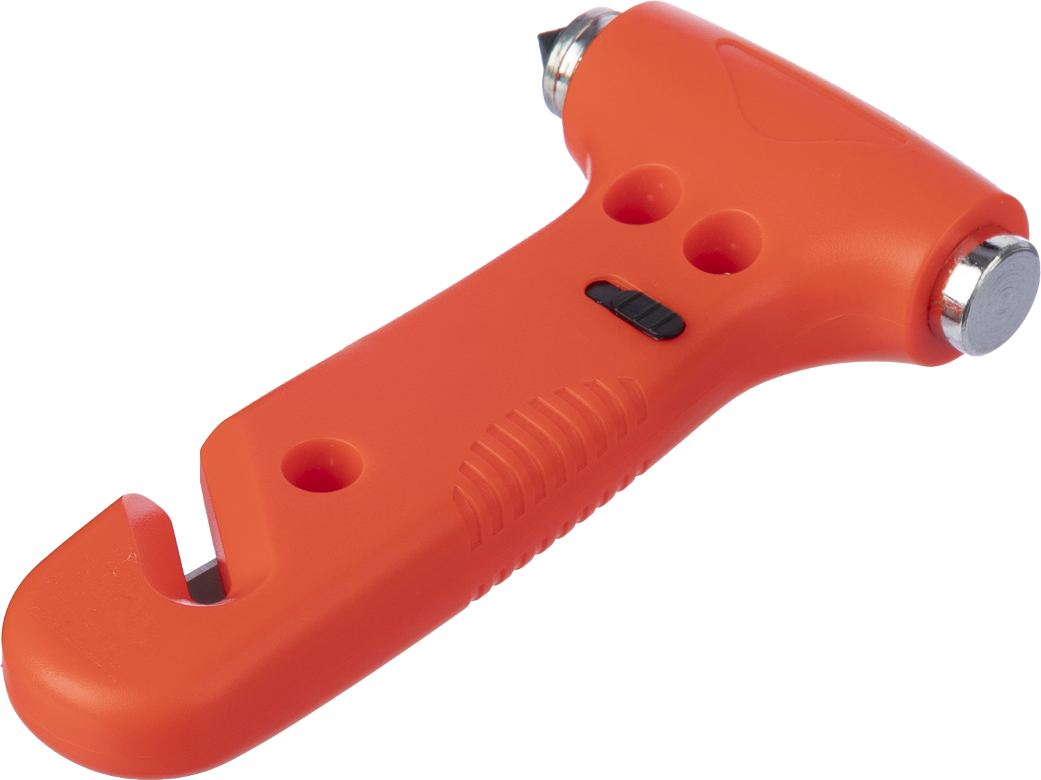 Emergency safety hammer with a white LED light, integrated seat belt cutter and window hammer. Individually packaged in a brown carton box.