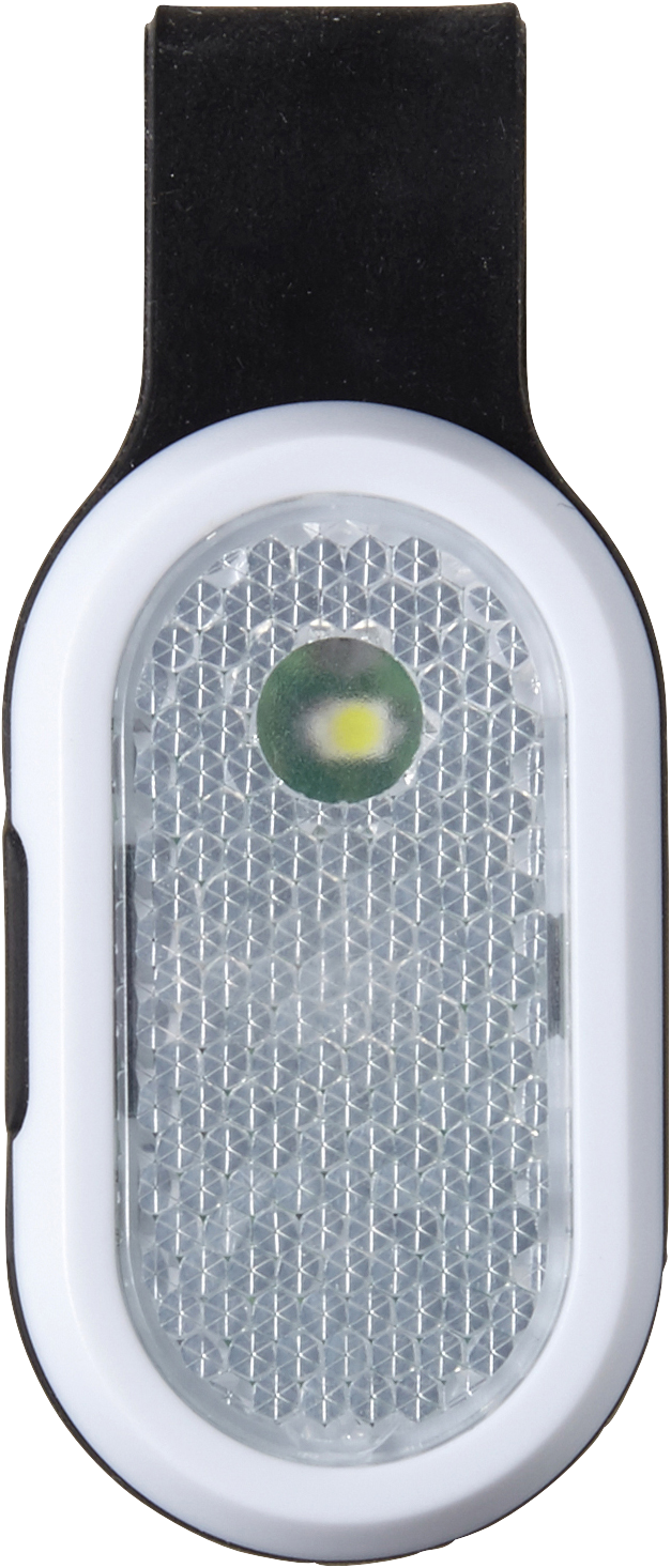 Safety light with powerful COB (chip on board) LED lights in both white and red. With strong magnets, the front and back are connected by a silicon strap. Batteries included.