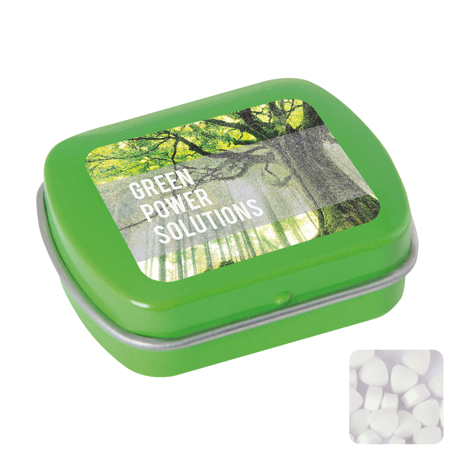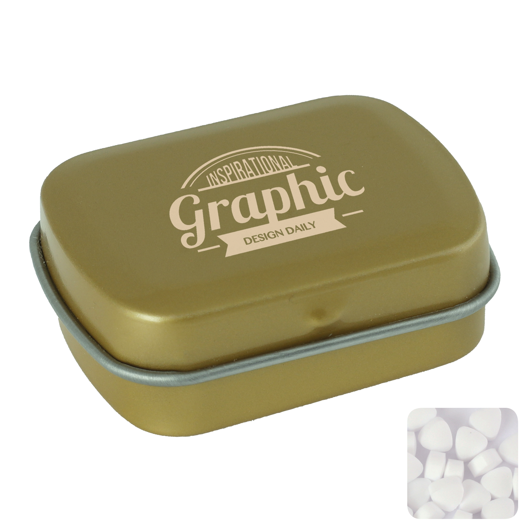 Small hinged flat tin with triangular extra strong sugar free mints.