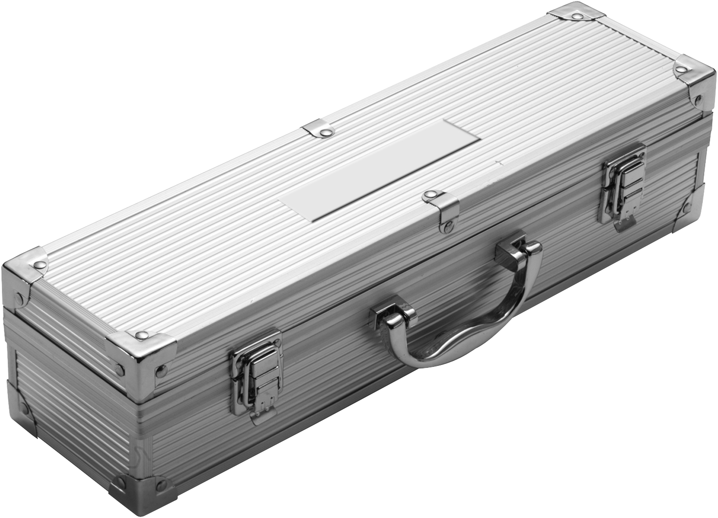 Three piece stainless steel barbecue set in an aluminium case includes spatula, fork and tongs.