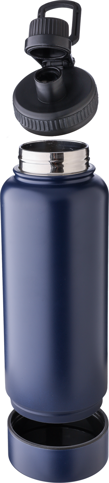 Stainless steel double walled drinking bottle. Features a PP lid with a screw dispenser and carrying loop. The base includes a small screw-on compartment for storage. Individually packaged in a brown cardboard box. Not dishwasher safe.