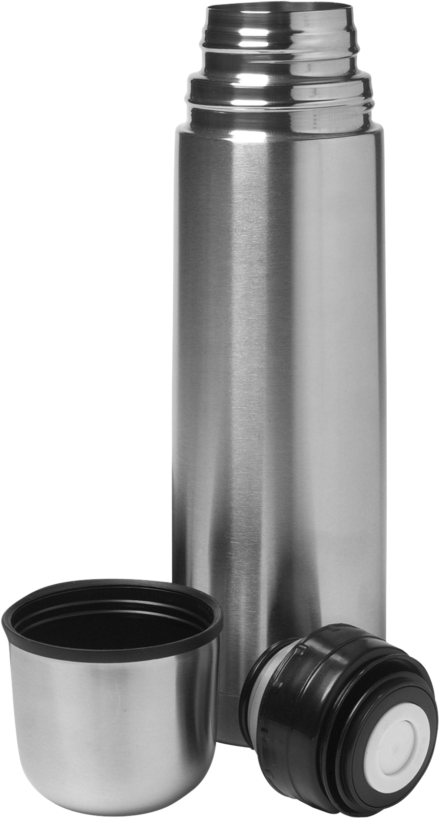 Stainless steel double walled vacuum flask (750ml), supplied in blue nylon (600D) case with a carrying strap. Not dishwasher safe.