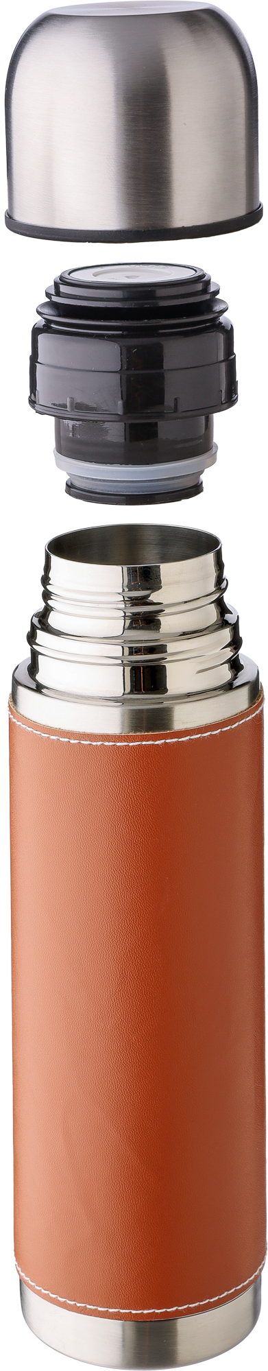 Stainless steel, PU covered flask. Individually packaged in a brown cardboard box. Not dishwasher safe.
