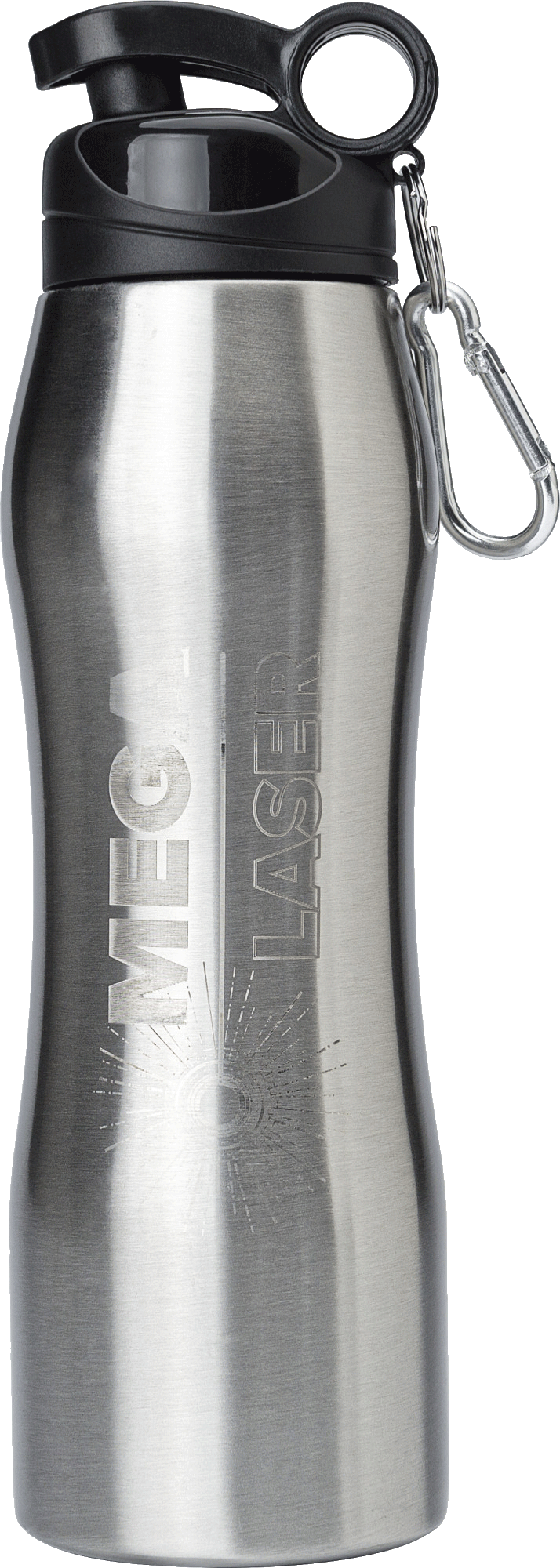 Stainless steel drinking bottle (750ml) with a carabiner clip attached. Not dishwasher safe.