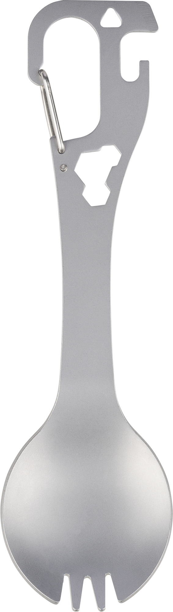 Stainless steel spork with fork and spoon, flat screwdriver, bottle and can opener and three hex keys. Includes a carabiner clip.