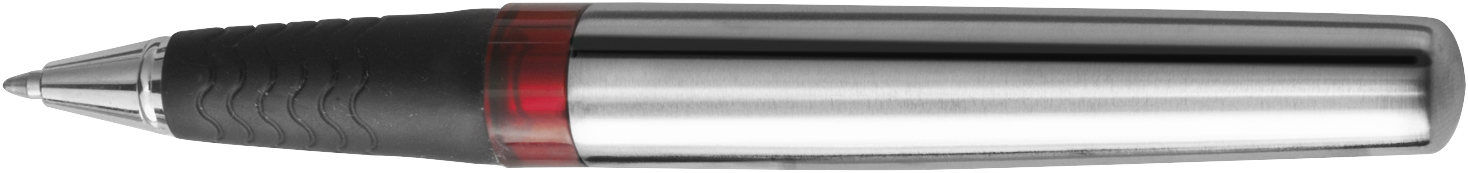 Stainless steel ballpen with a translucent coloured plastic ring and black ink.
