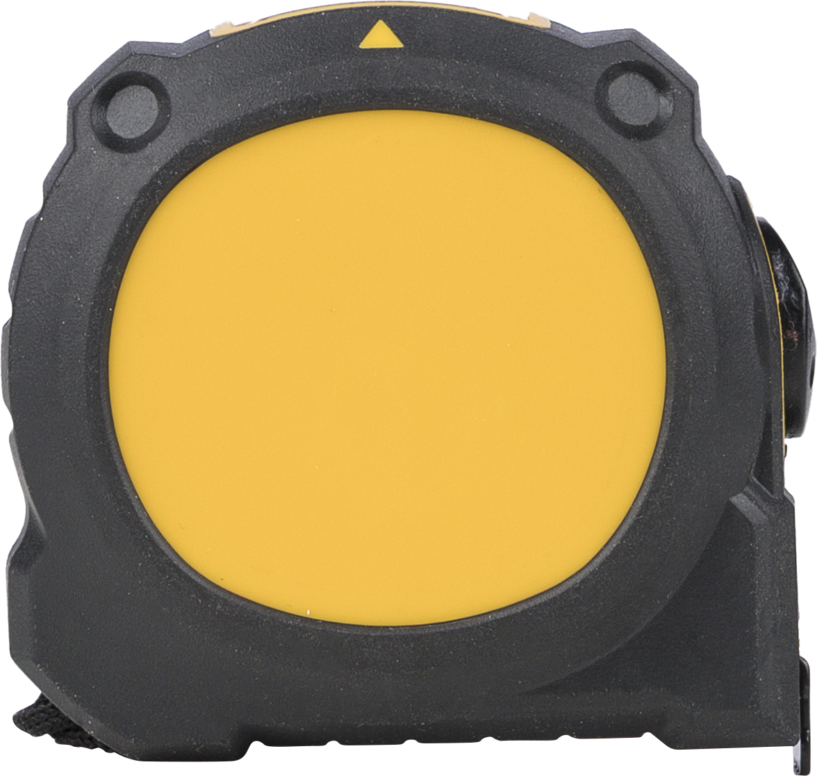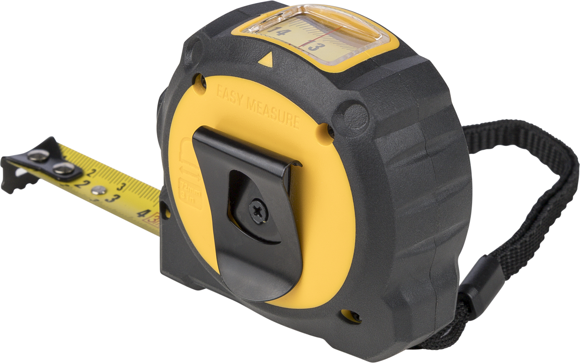 Rubber feel 3m tape measure with a transparent top window for precise inside measurements. Includes lock/release function, back clip and polyester wrist strap. Packed in brown box.
