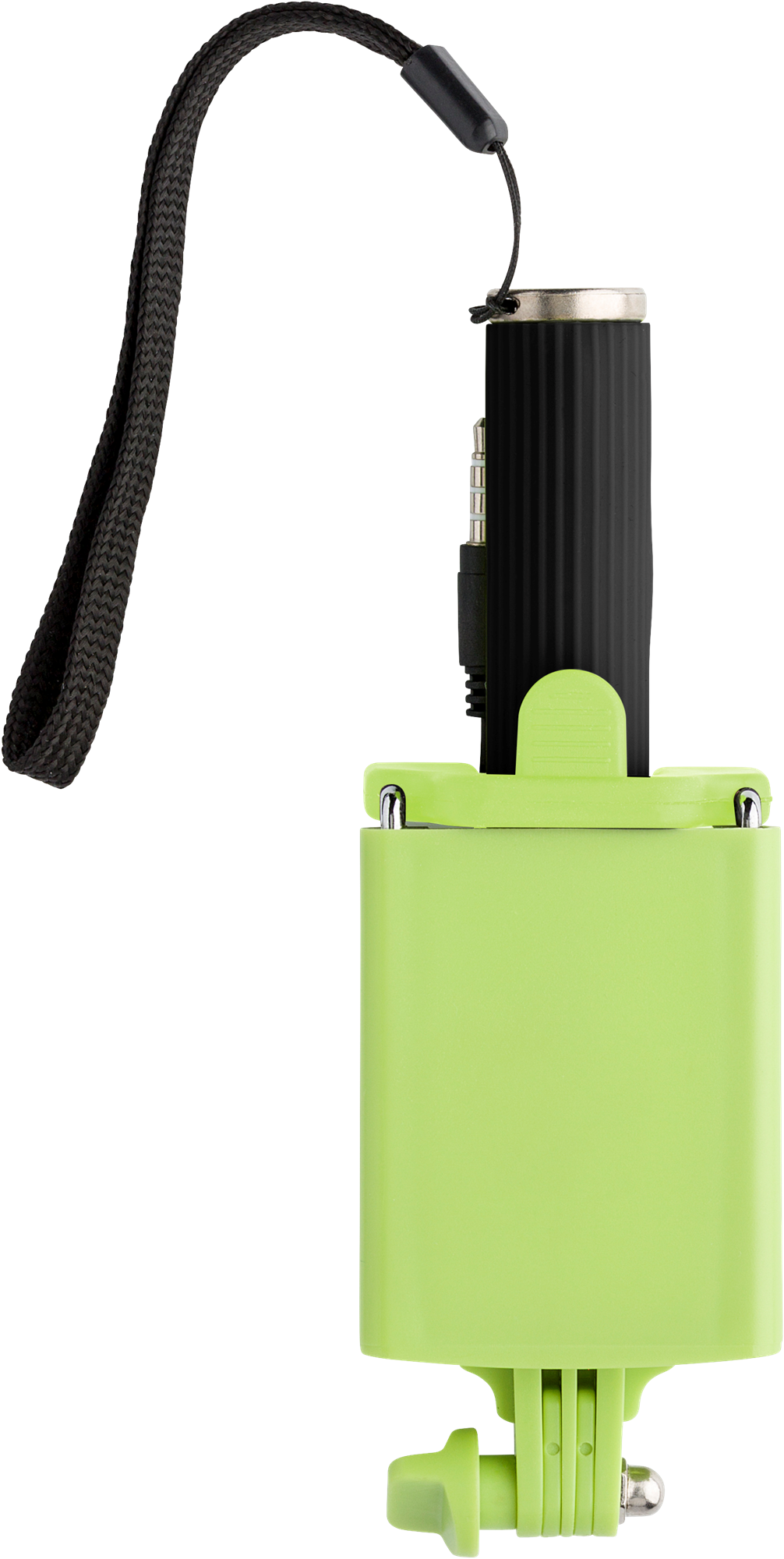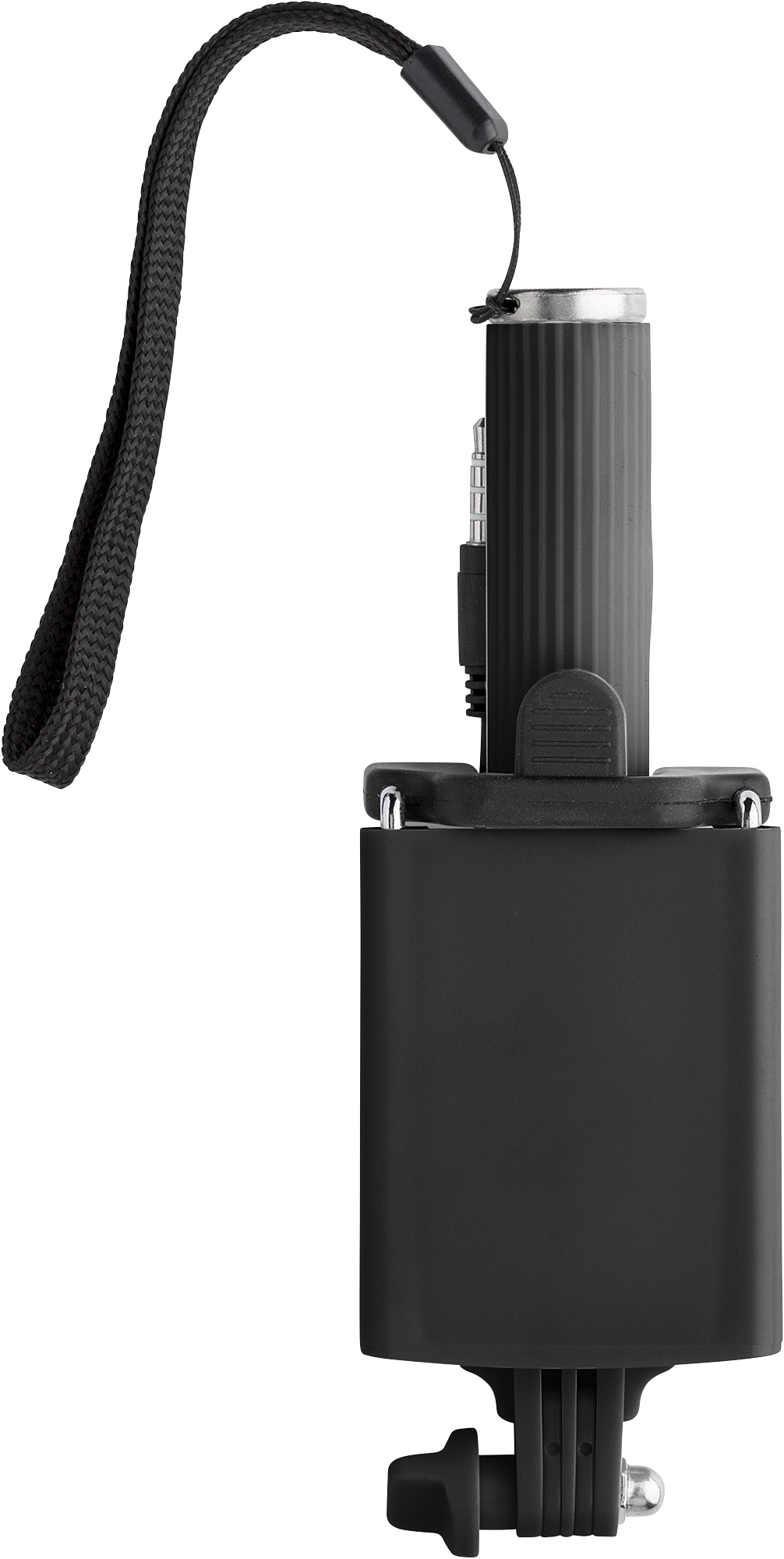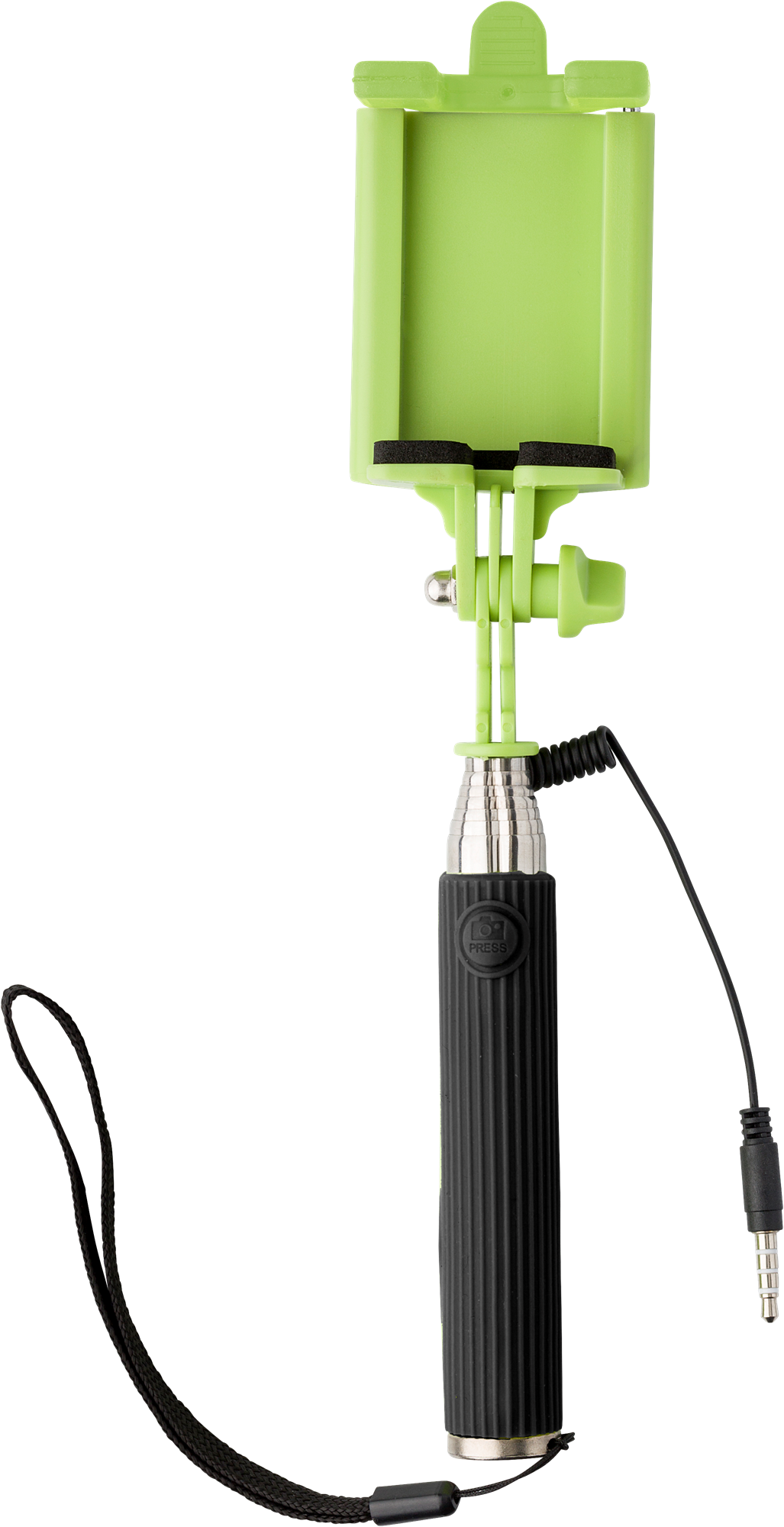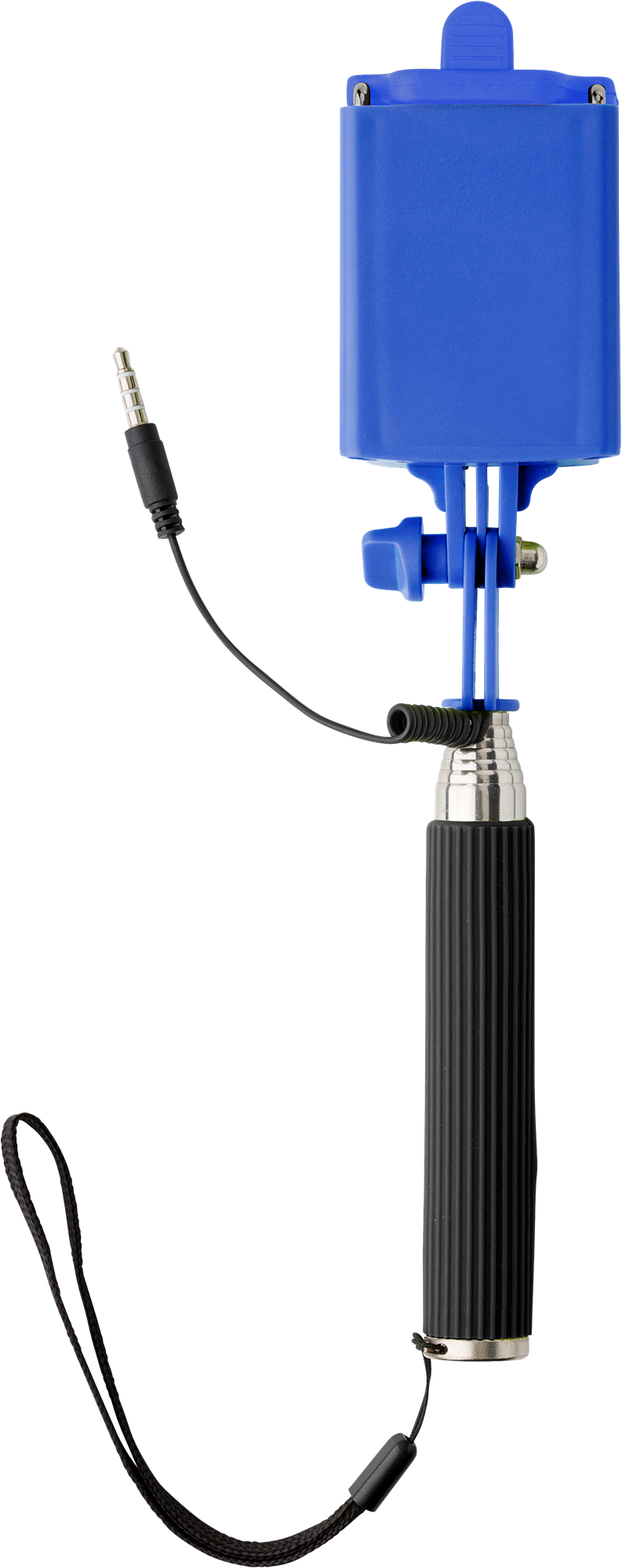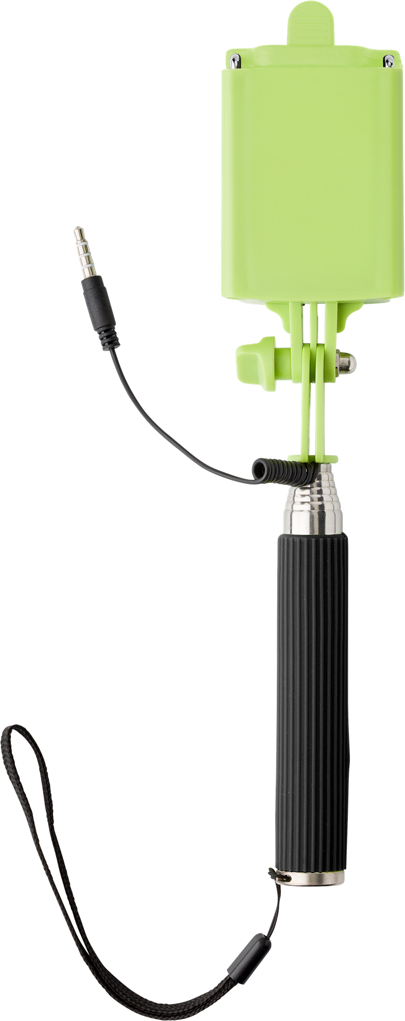 Plastic telescopic selfie stick, expandable to a max of 61 cm with a ribbed silicon handle, including a push button, includes a black cable with plug, approx. 26 cm long.
