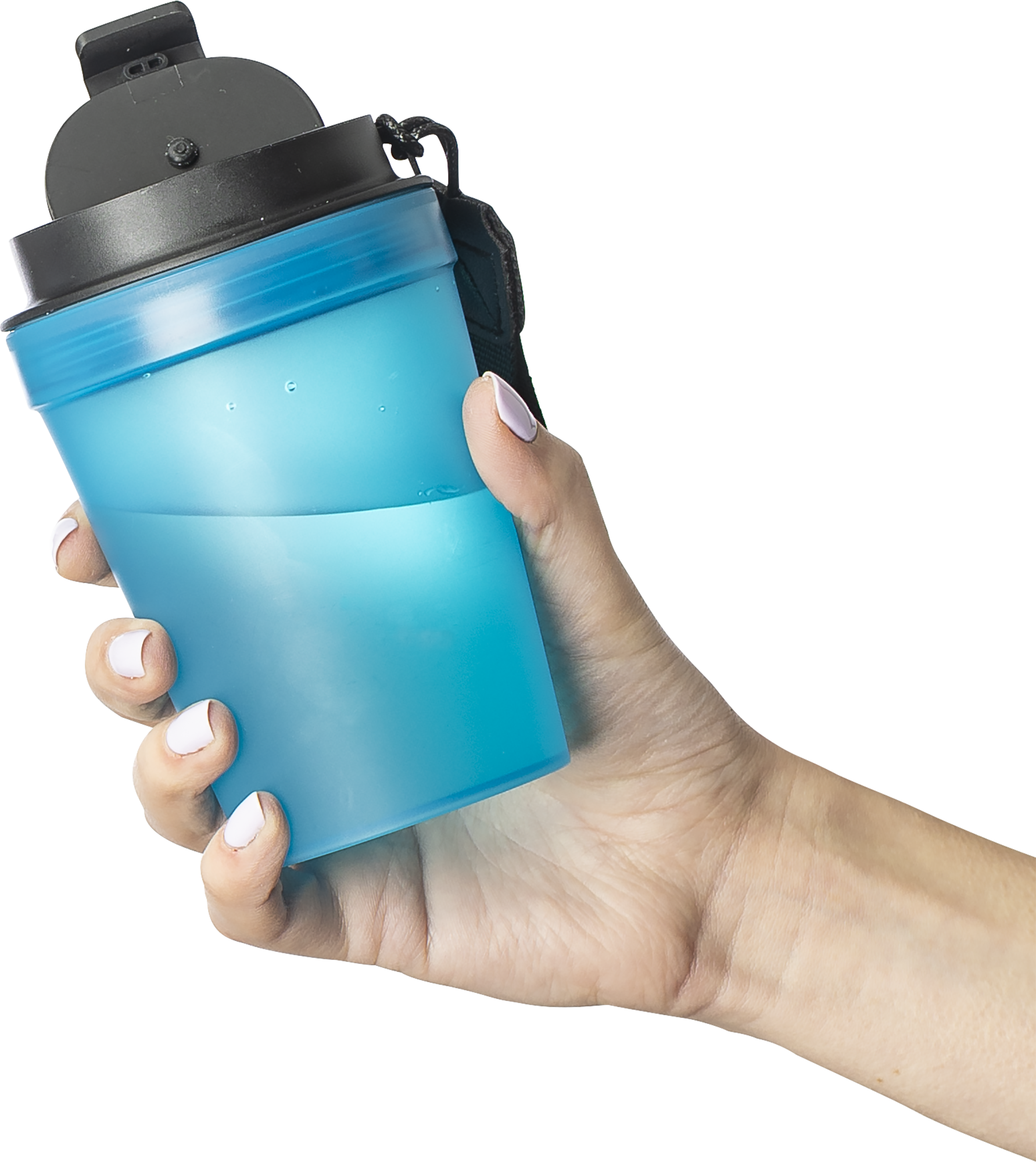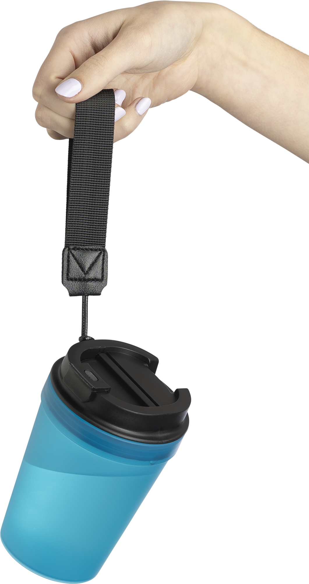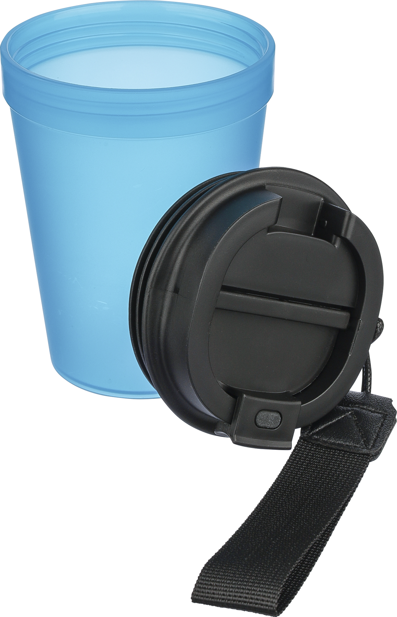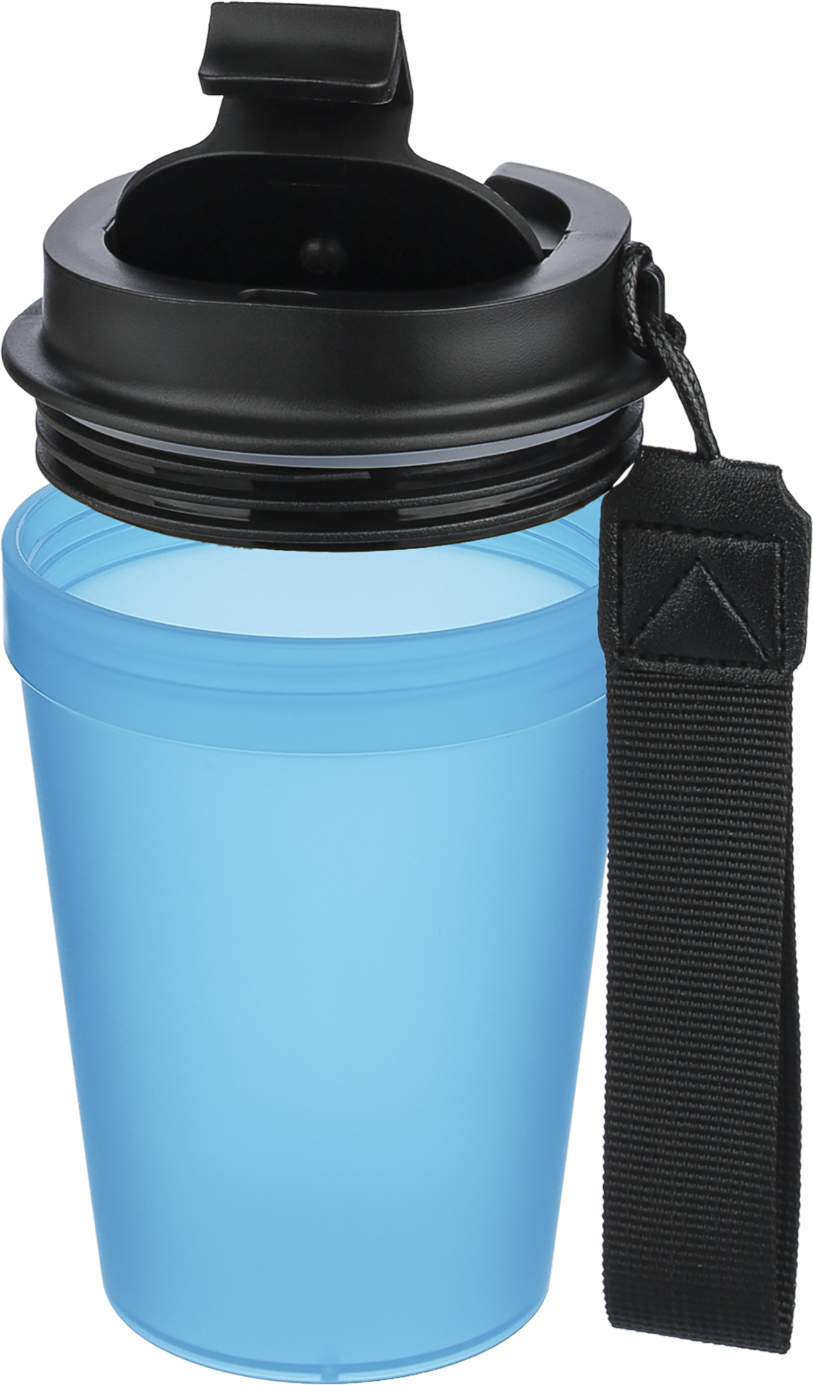 Transparent single-walled mug with a 350 ml capacity and thick-walled design. Features a screw-on lid and a polyester wrist cord for easy carrying. Suitable for warm drinks, but note that heat transfer may occur due to the single-wall construction.