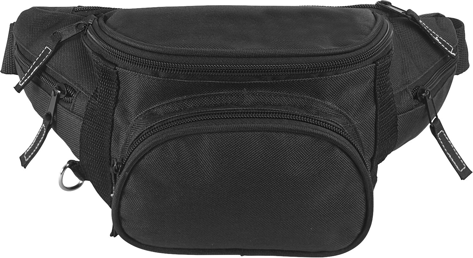 Polyester (600D) waist bag with five zipped pockets and adjustable strap.