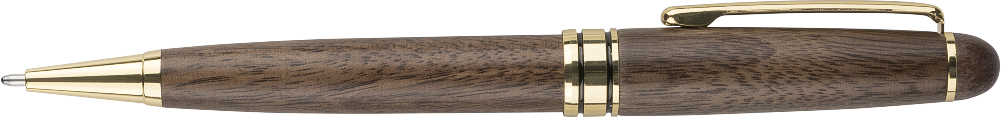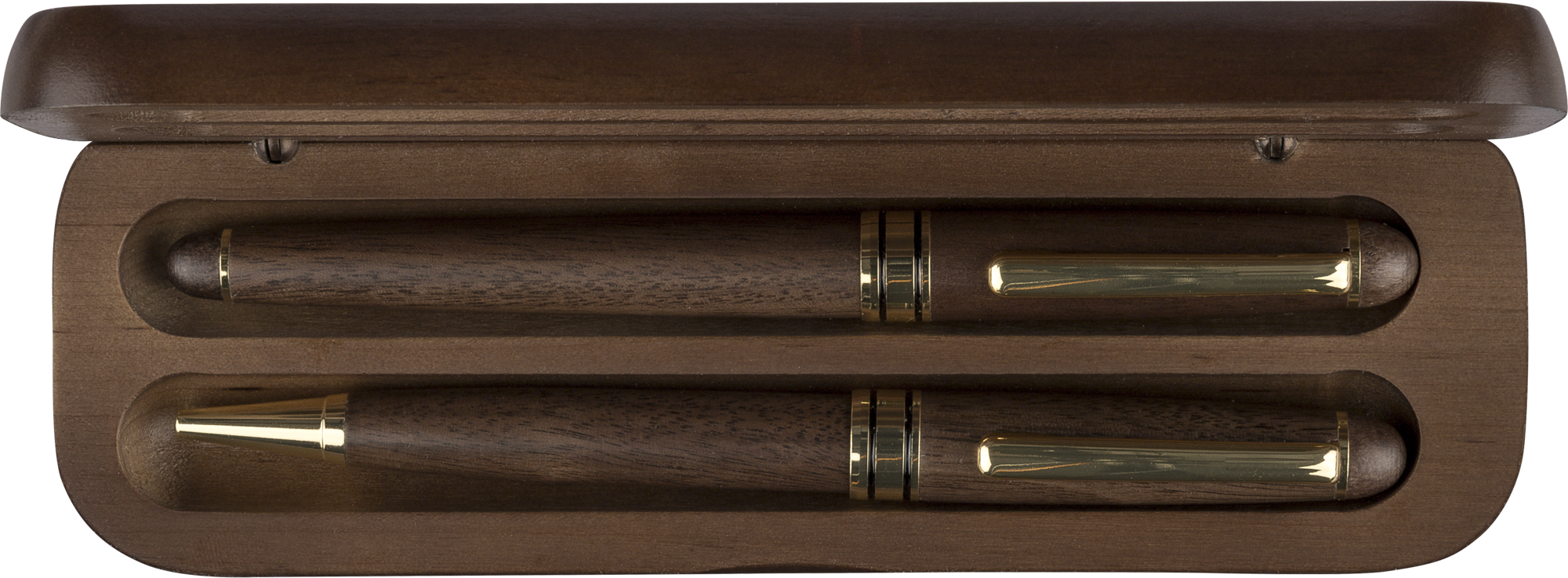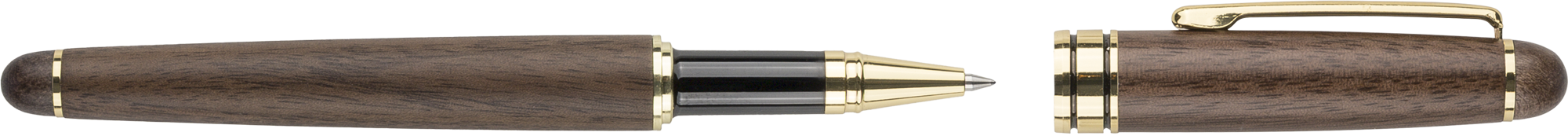 Walnut and brass twist action ballpen and rollerpen, both with blue German Dokumental ink, supplied in a maple wooden box and brown box.