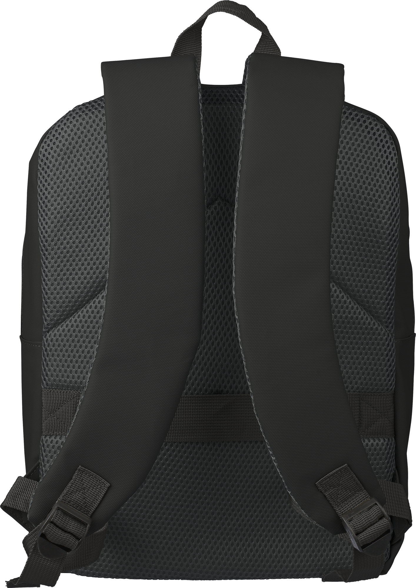 Laptop backpack (15 inch) with two zipped front pockets and a large zipped main compartment with a Velcro-closed laptop section. Ventilated padded back with a trolley strap and adjustable shoulder straps.