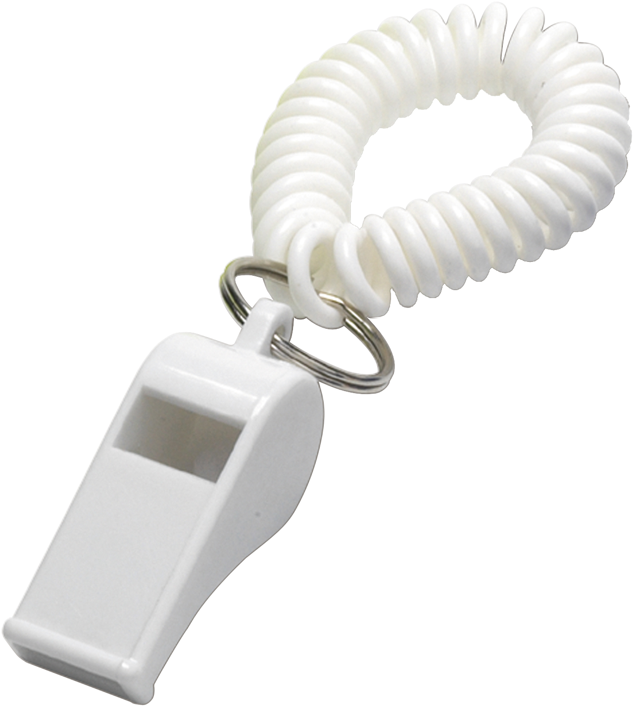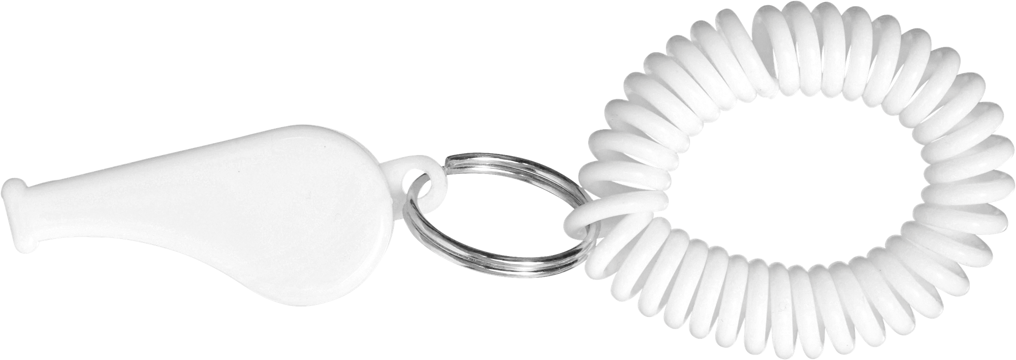 Plastic whistle with a spiral wrist cord.