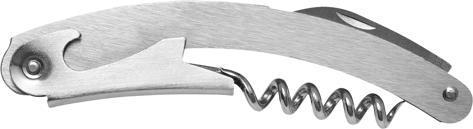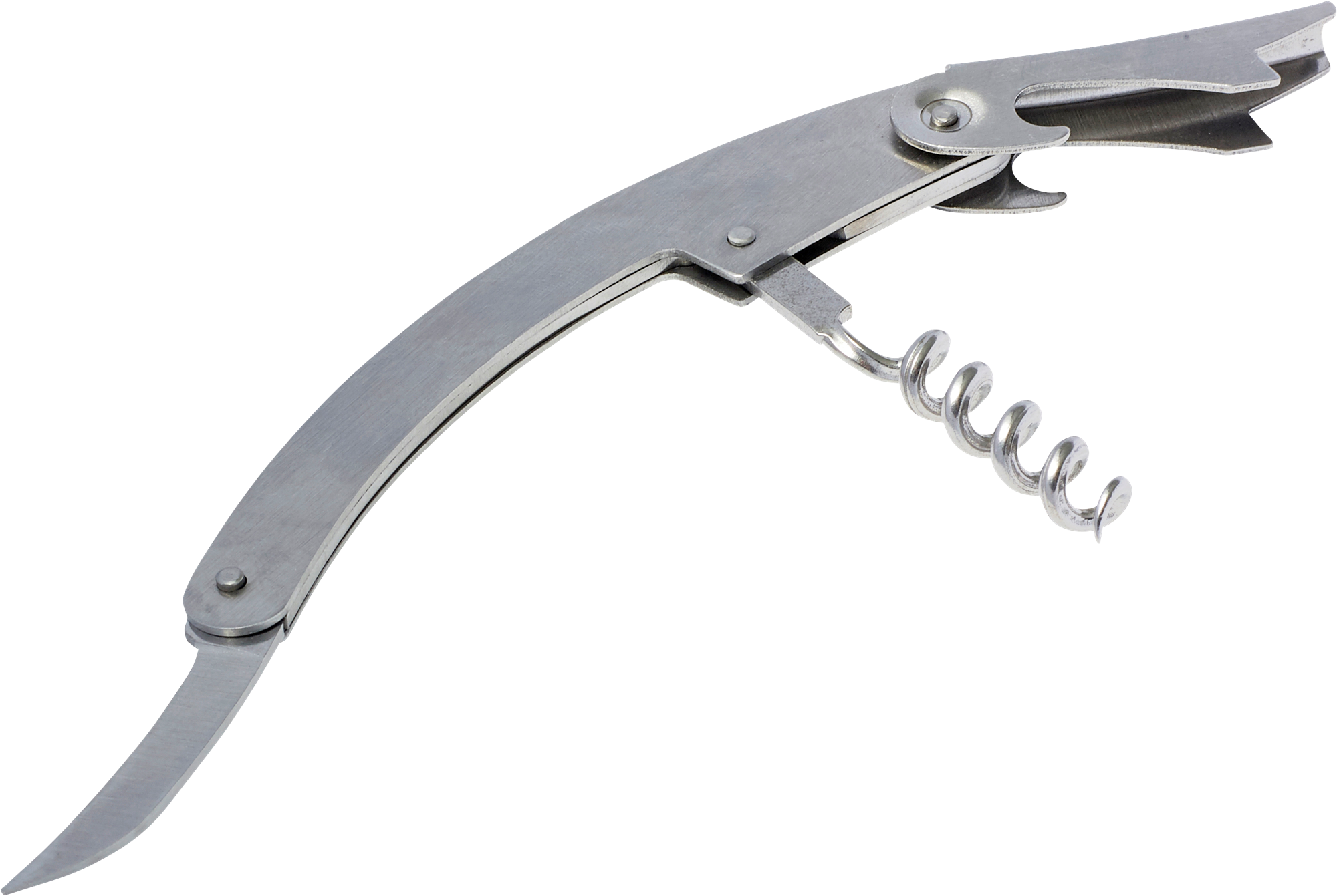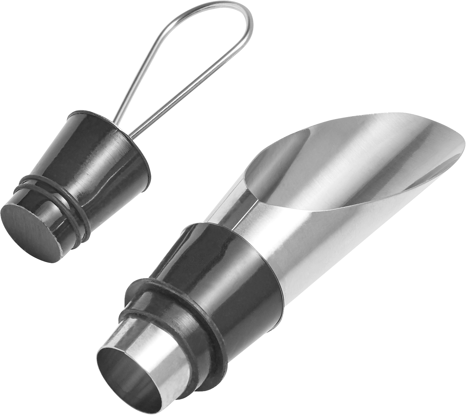 Two piece stainless steel wine set, consisting of a waiter's knife and bottle stopper with pouring spout.