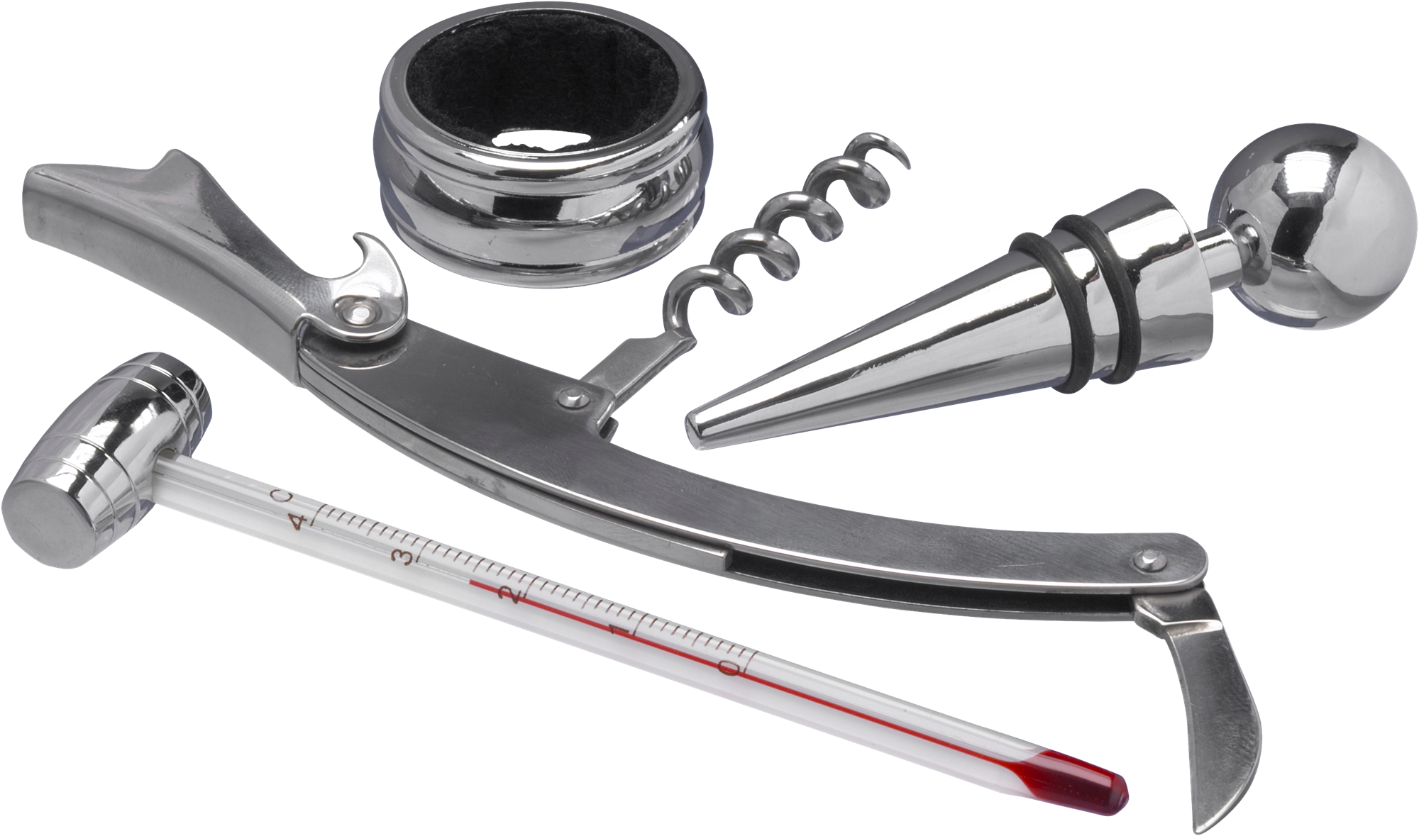 Four piece wine set presented in a deluxe wooden gift box, includes a waiters friend, temperature gauge, bottle stop and a drip neck collar.