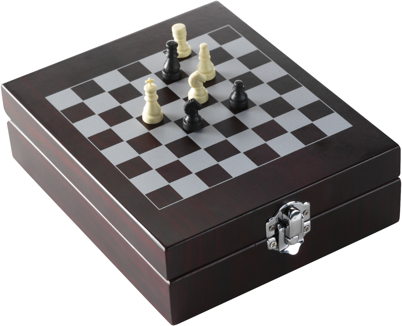 Four piece wine set with a chess-game in a wooden gift box includes chess game, bottle stop, temperature gauge, drip neck collar and a waiters friend.