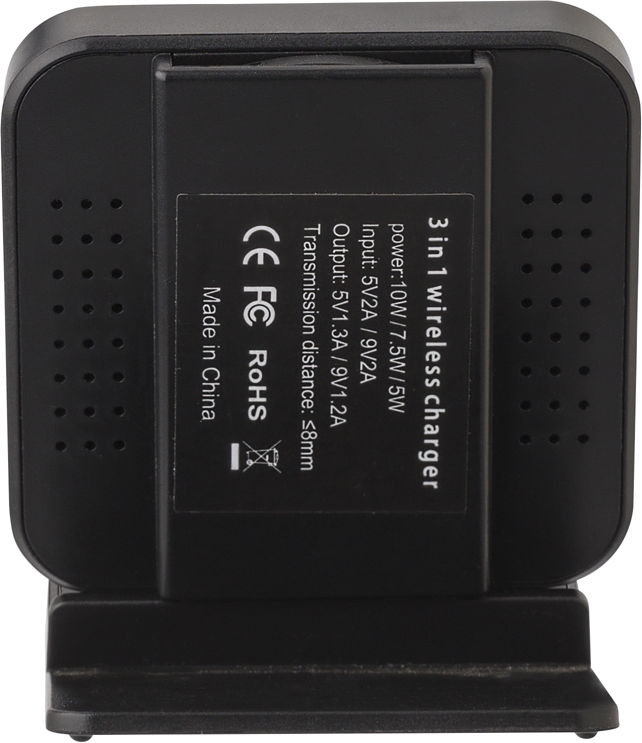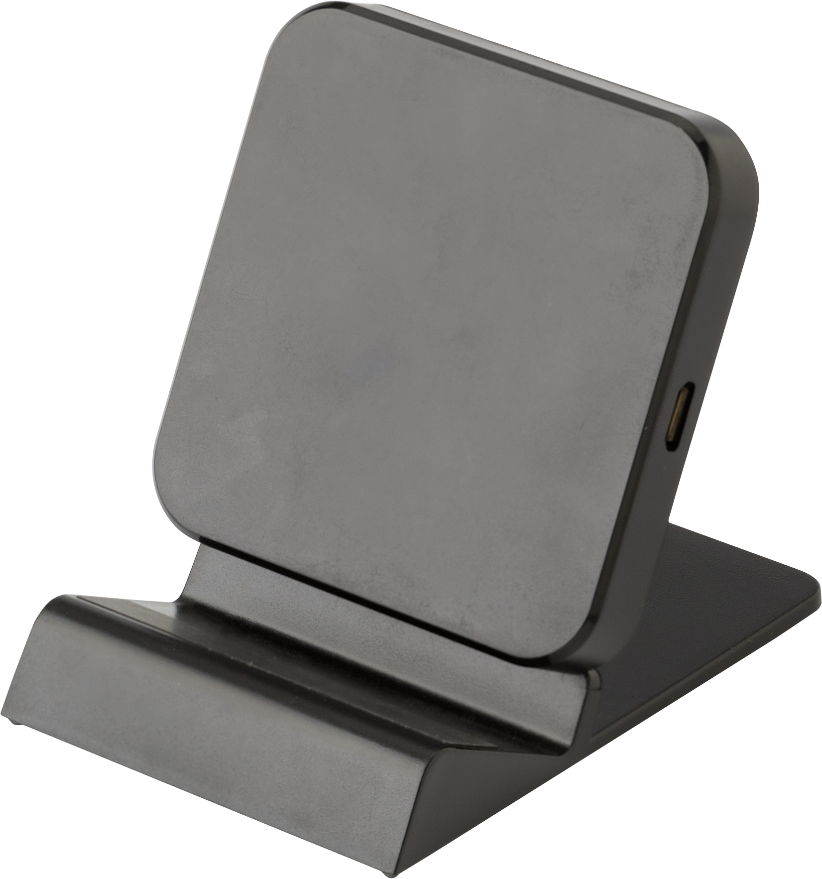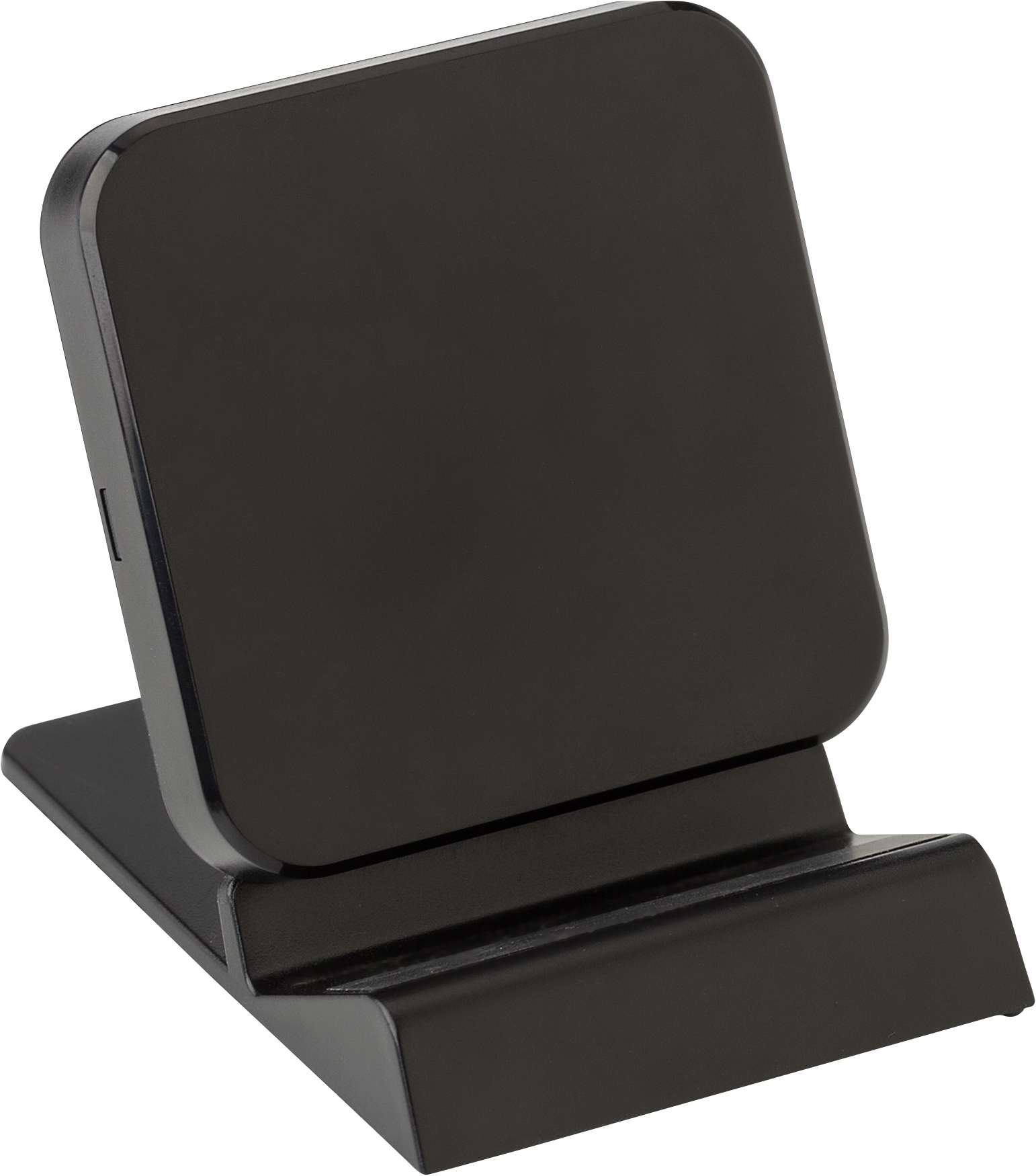 Plastic wireless charger and phone stand. The charging pad is adjustable in height. Stand is suitable for both portrait and landscape mode. Rechargeable via micro USB port. Input: 5V2A/9V2A, output: 5V1.3A/9V1.2A.