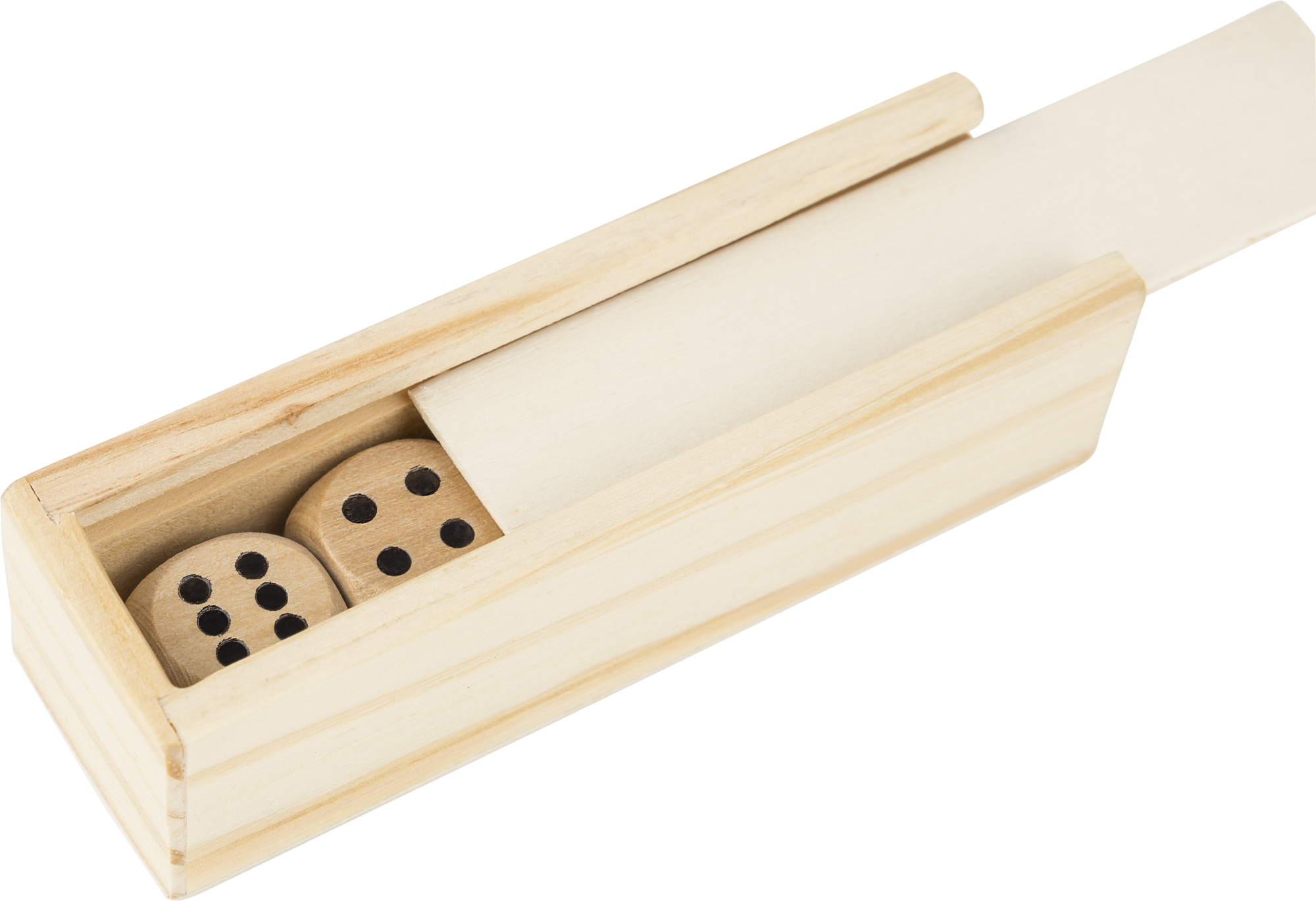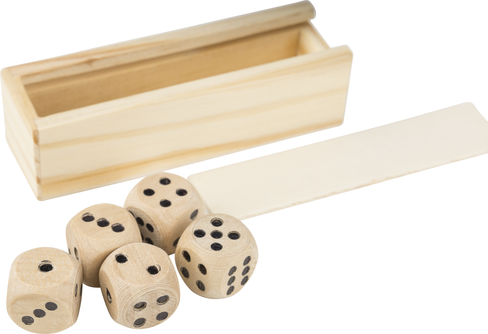 Beech wooden set of 5 dice in a matching box with sliding lid. Ideal for classic dice games. Individually packaged in a brown box.