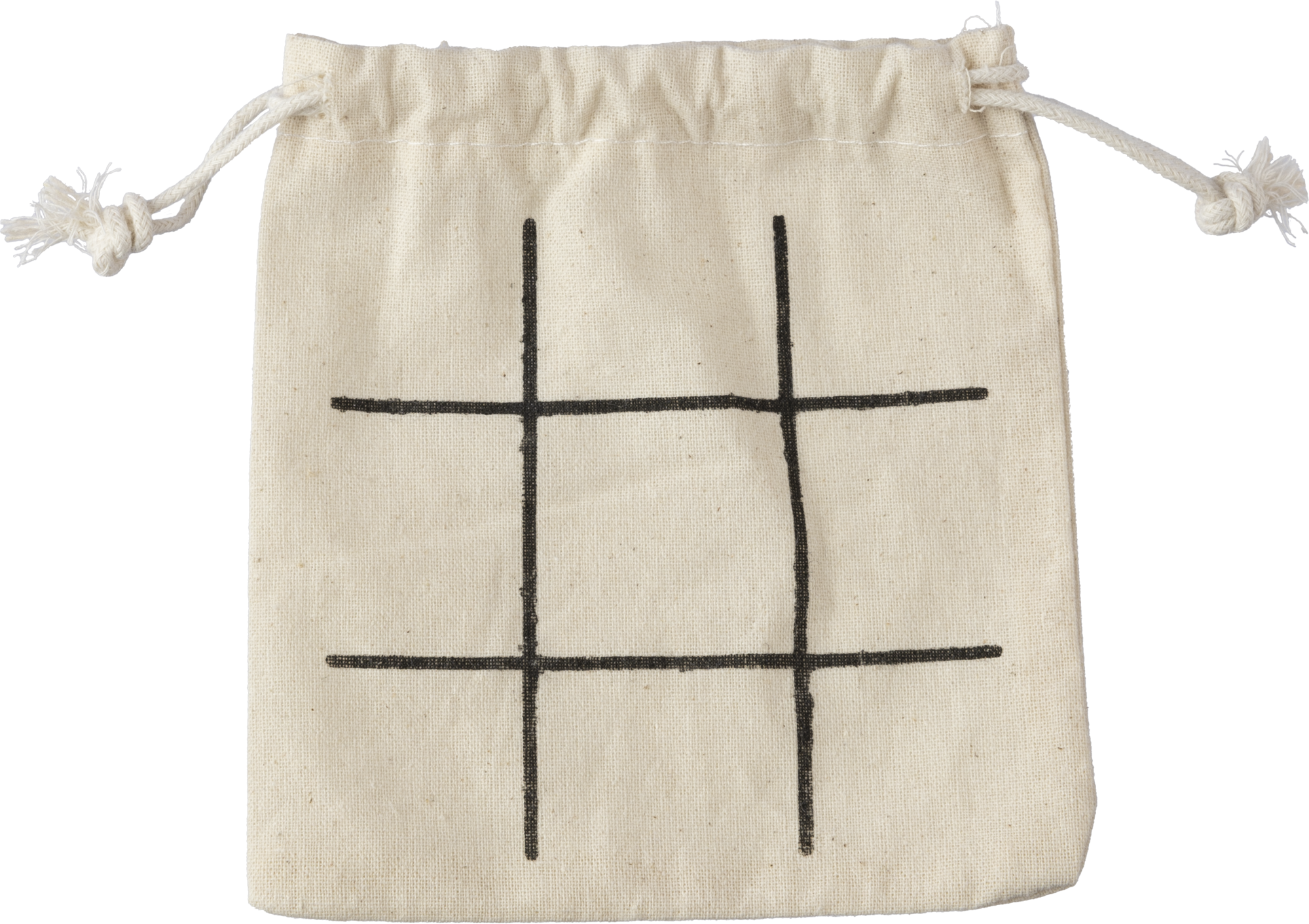 Natural wooden tic-tac-toe game, including 10 small wooden chips packaged in a cotton drawstring pouch.
